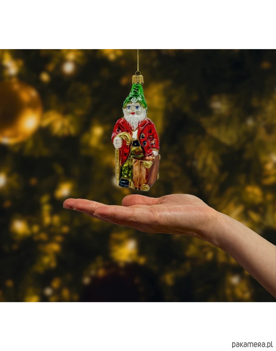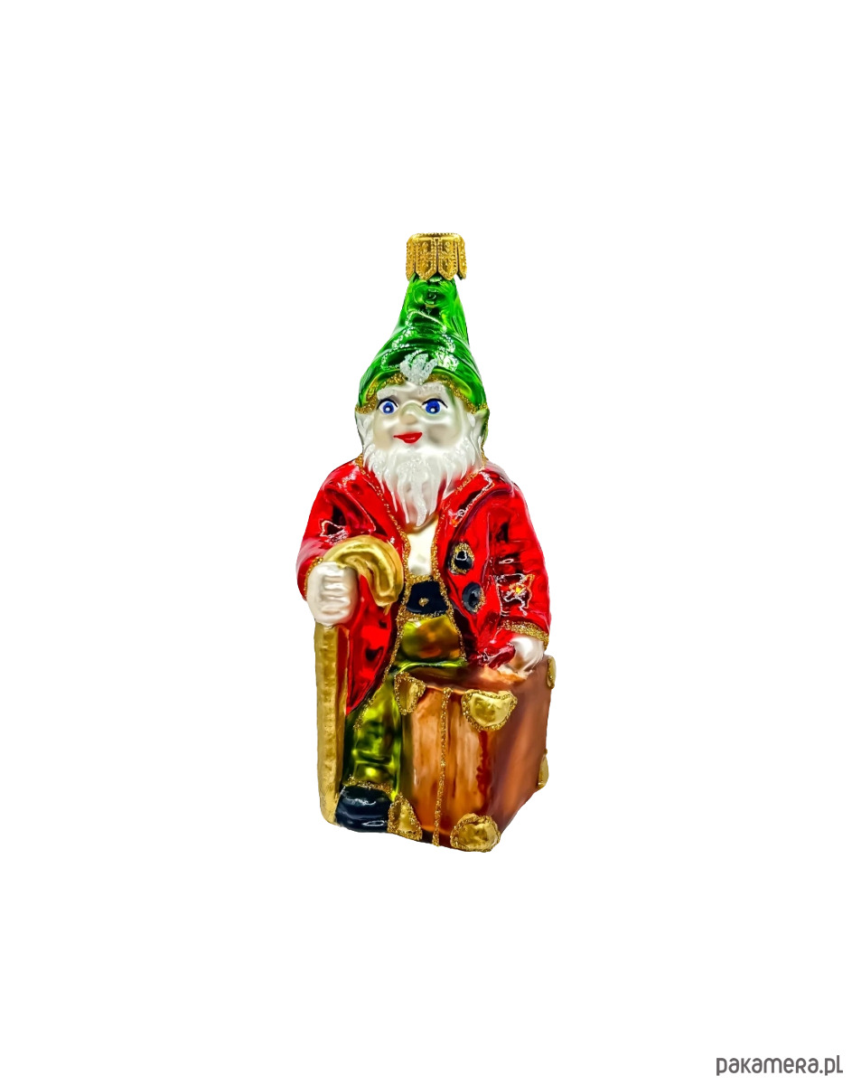 Bombka przedstawia uroczego skrzata z długą białą brodą, który dumnie trzyma złotą laskę symbolizującą podróż i przygodę. Obok niego stoi detalicznie wykonany kufer podróżny z realistycznymi zdobieniami, nawiązujący do klasycznego bagażu. Postać skrzata jest pełna wyrazu, a jego uśmiech dodaje dekoracji ciepłego, świątecznego charakteru.