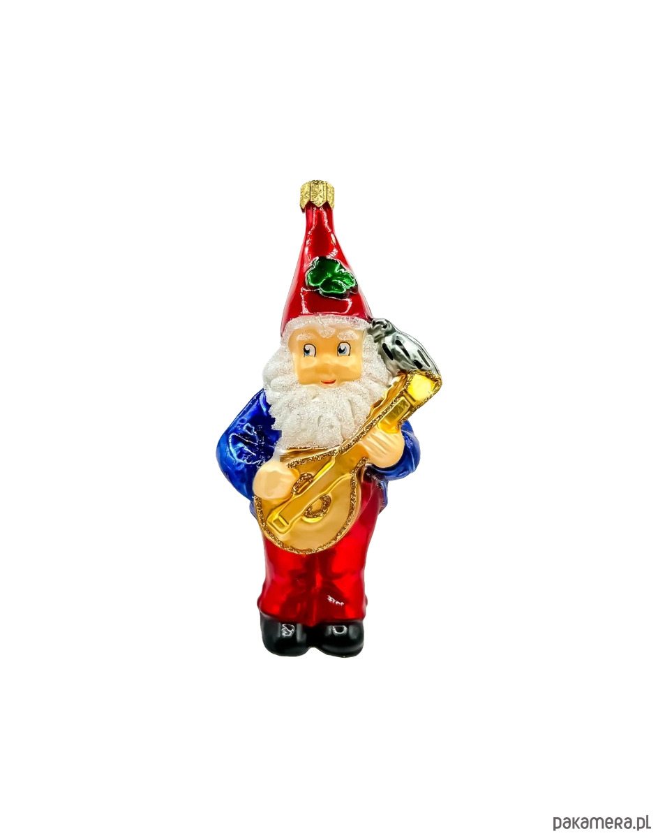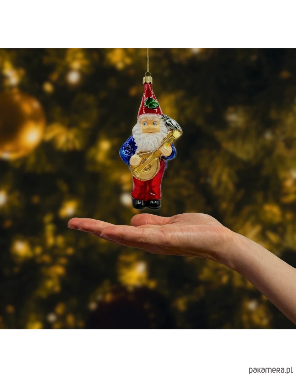 Bombka przedstawia skrzata w charakterystycznej czerwonej czapce ozdobionej motywem zielonej koniczyny. Skrzat trzyma w rękach złotą mandolinę, co nadaje ozdobie wyjątkowego, muzycznego charakteru. Ta kompozycja idealnie oddaje radosny i magiczny klimat świąt.