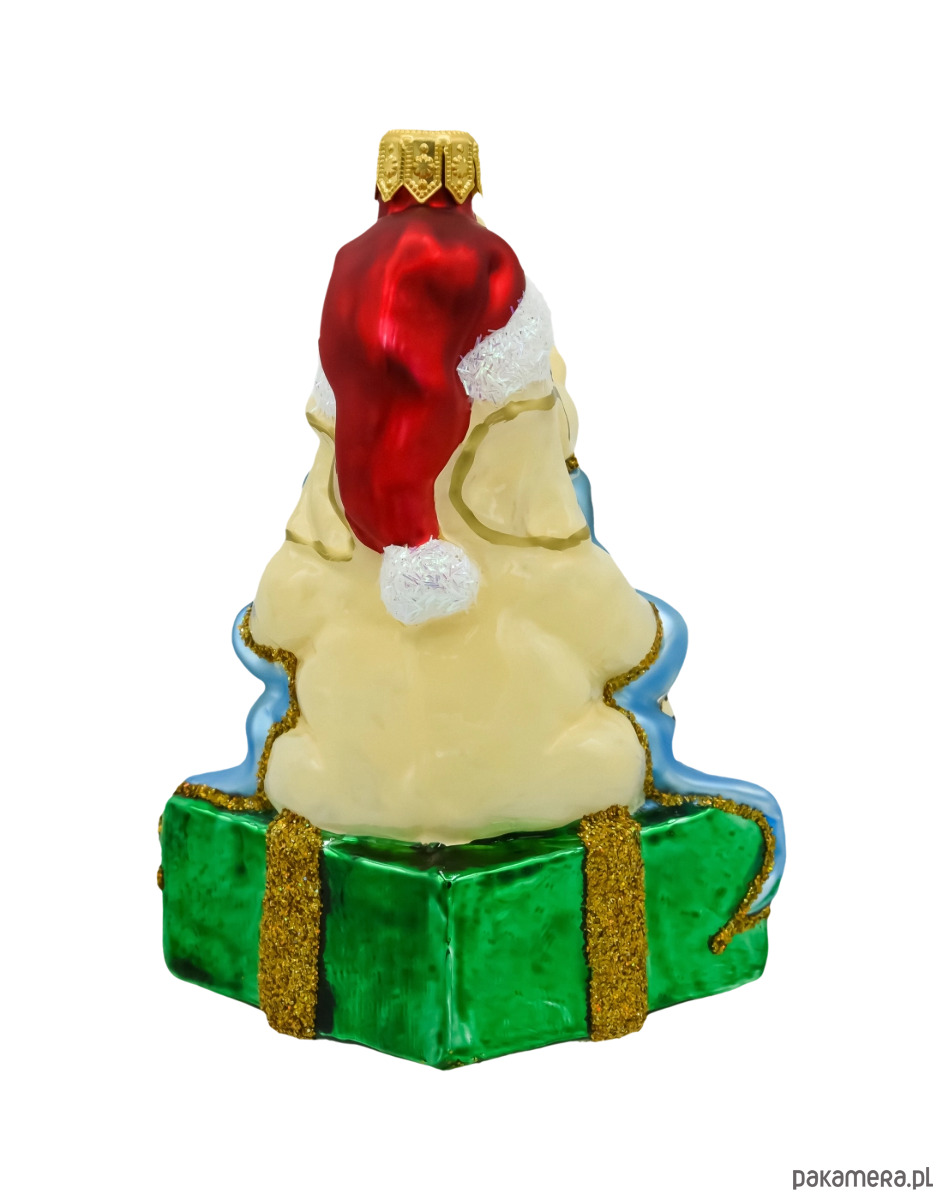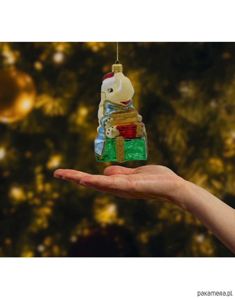 Przenieś magię dziecięcej radości na swoją choinkę dzięki tej uroczej bombce choinkowej w kształcie słonika z prezentami. Uśmiechnięty słoń ubrany w świąteczną czapkę Mikołaja oraz niebieski szalik siedzi na dużym zielonym prezencie, a przed sobą trzyma kolorowe pakunki – wszystko lśni i połyskuje dzięki brokatowym detalom i intensywnym barwom. To idealna dekoracja dla tych, którzy uwielbiają bajkowy klimat, świąteczny humor i nietypowe, ręcznie zdobione ozdoby.