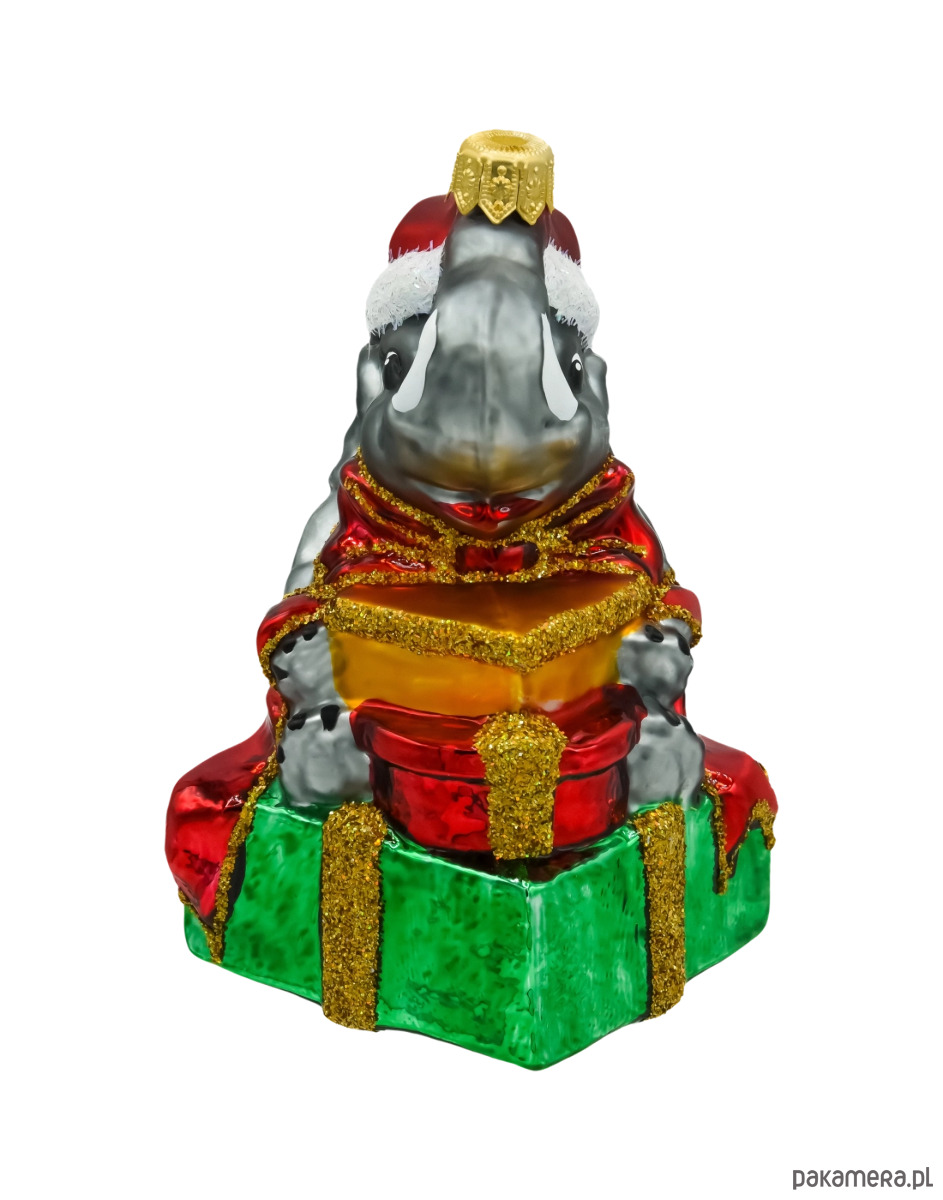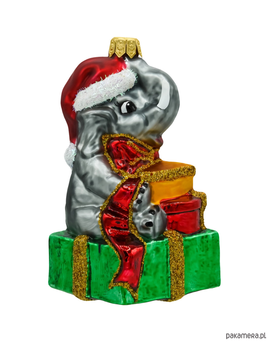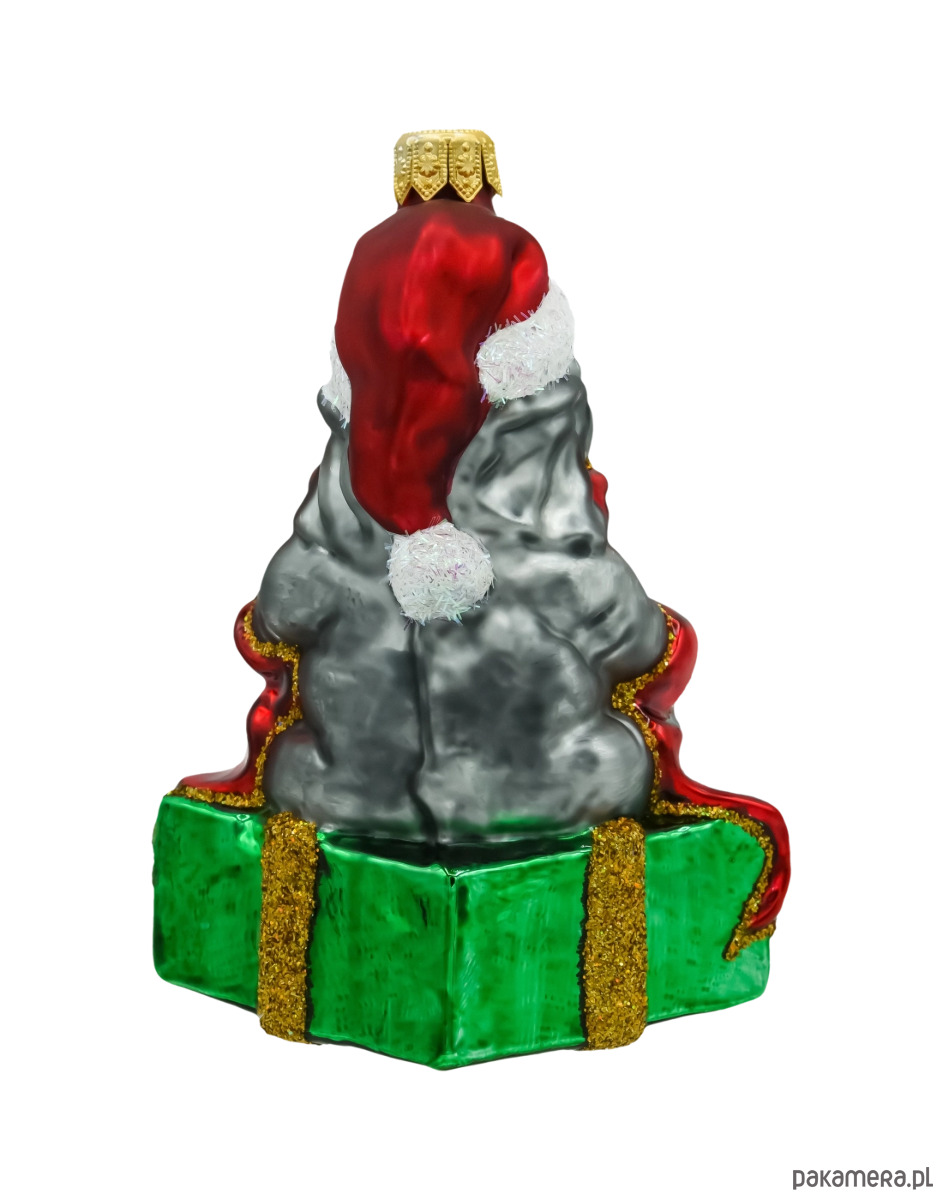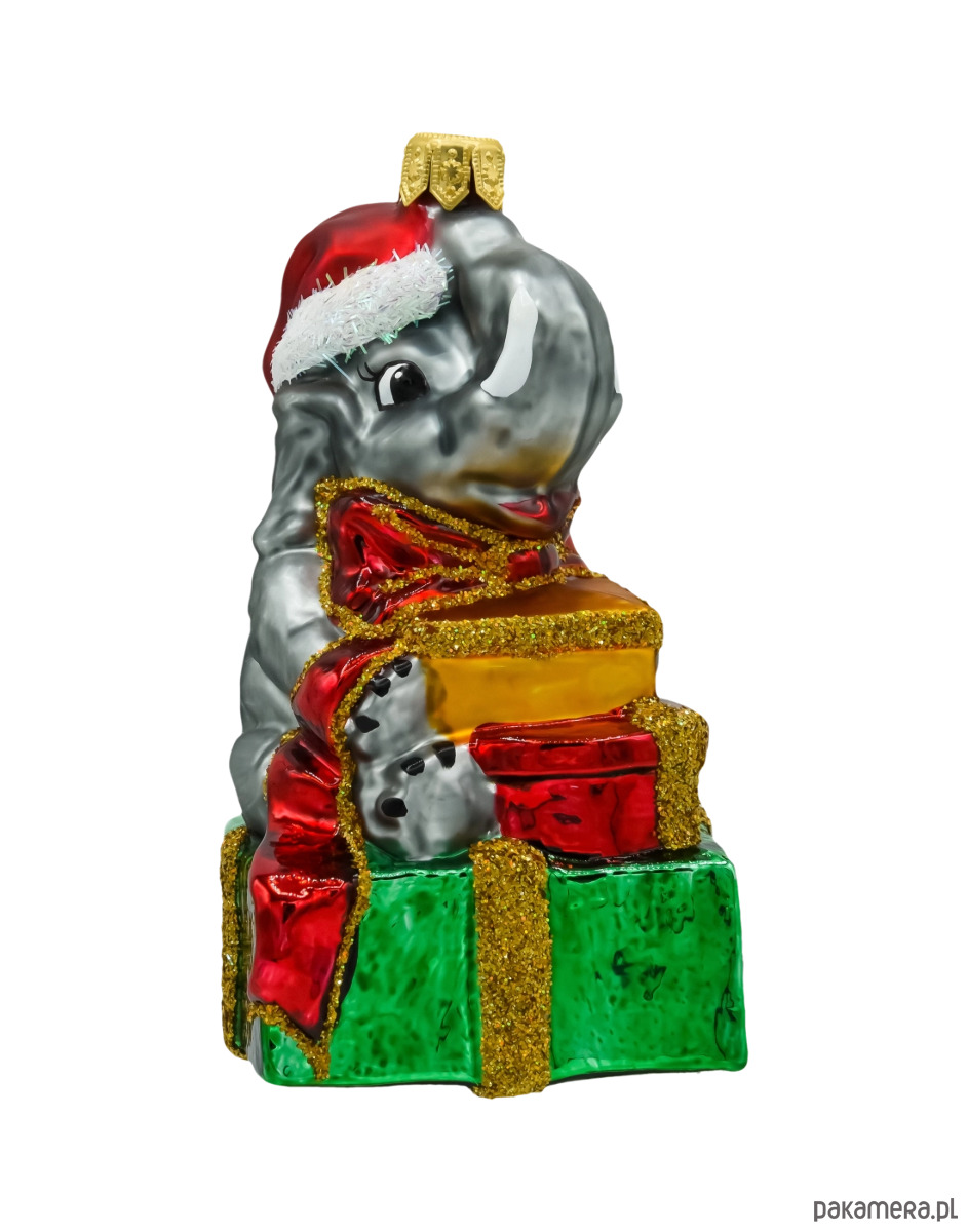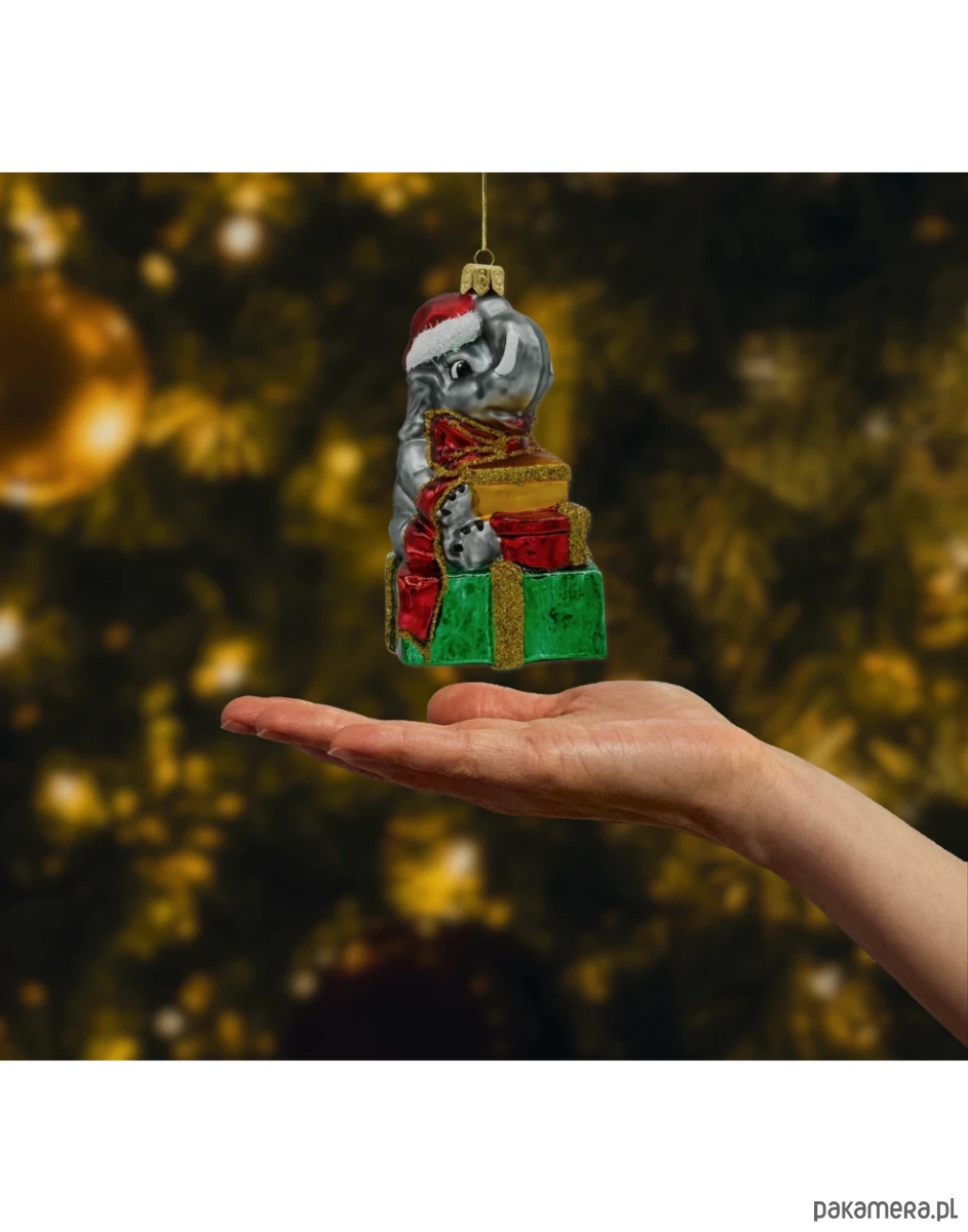 Oto niepowtarzalna bombka, która wprowadzi uśmiech na każdej choince! Przedstawiamy uroczego słonika w odcieniu metalicznej szarości, który zasiadł wygodnie na dużym zielonym prezencie, otoczony barwnymi pudełkami i przyodziany w czerwoną czapkę Mikołaja oraz połyskujący szalik z brokatowym wykończeniem. Bombka została wykonana z najwyższej jakości dmuchanego szkła i ręcznie ozdobiona z dbałością o każdy szczegół – od czarno-białych detali na trąbie po błyszczące złote kokardy na prezentach.