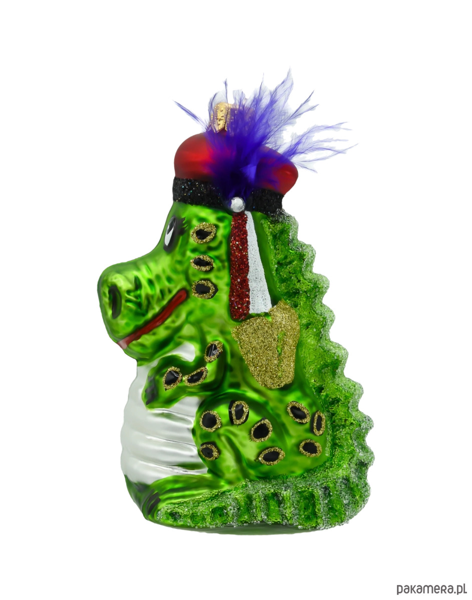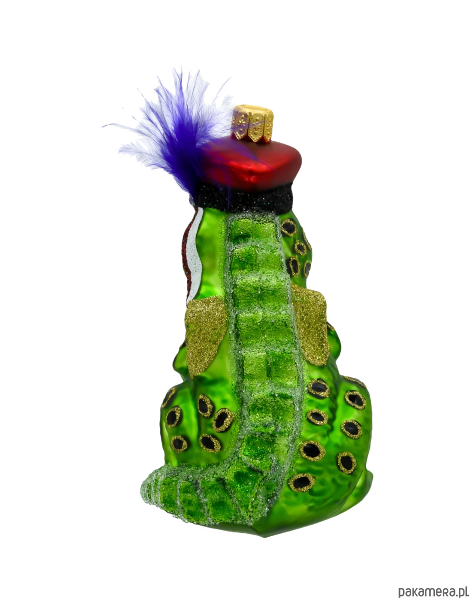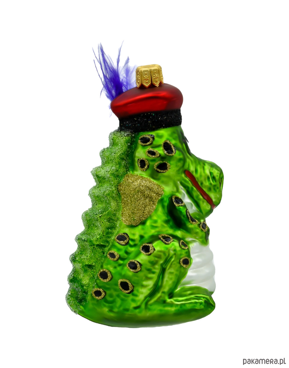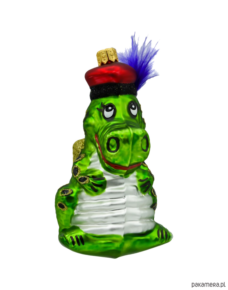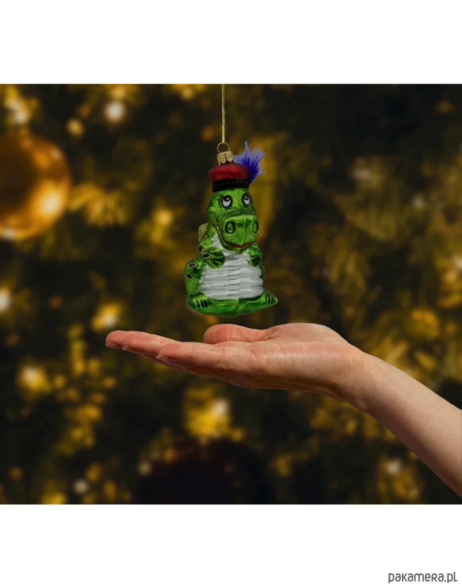 Oto niezwykła bombka choinkowa „Smok Wawelski”, która łączy w sobie bajkowy urok i regionalną symbolikę. Wykonana ręcznie ze szkła, ta unikatowa ozdoba przedstawia sympatycznego smoka w intensywnie zielonym kolorze, ozdobionego złotymi łuskami, czarnymi akcentami oraz błyszczącym, czerwonym beretem z piórem w odcieniu królewskiego fioletu. Jego duże, urocze oczy i delikatny uśmiech sprawiają, że bombka emanuje ciepłem i humorem, idealnie wpisując się w magiczną atmosferę Świąt Bożego Narodzenia.
