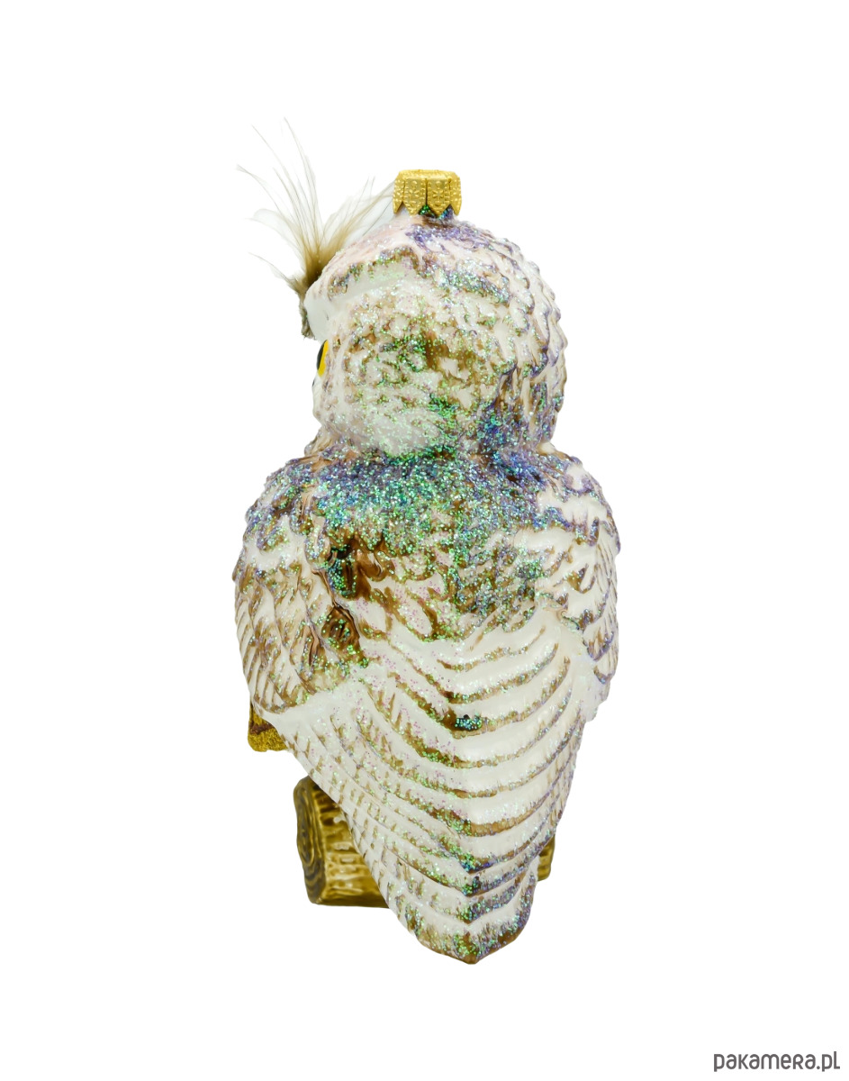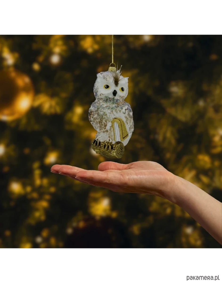 Szklana bombka choinkowa „Sowa na gałęzi” to wyjątkowa ozdoba, która doda świątecznej choince nie tylko uroku, ale też symbolicznej mądrości i klasy. Przedstawia piękną, ręcznie malowaną sowę siedzącą na złotej książce, z piórkami na głowie i brokatowym wykończeniem, które przyciąga wzrok i cudownie odbija światło lampek choinkowych. Oczy sowy są wyraziste, z intensywnie żółtymi tęczówkami, a każdy detal — od tekstury piór, przez kolorystykę, aż po opalizujące akcenty — świadczy o wysokiej jakości wykonania.