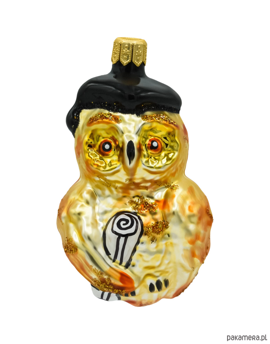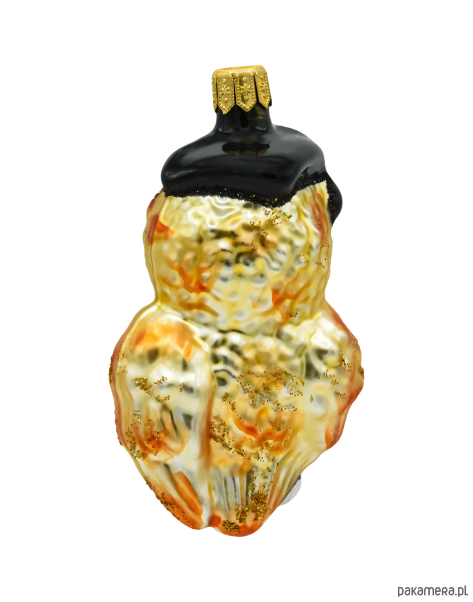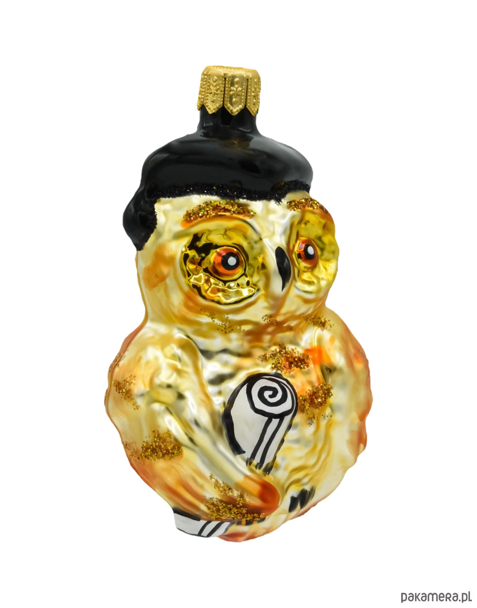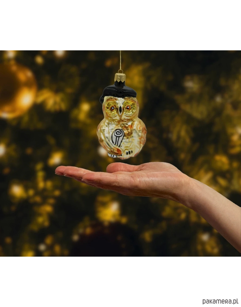 Bombka przedstawia uroczą sowę o złocisto-brązowym ubarwieniu, trzymającą zwinięty dyplom. Biret w głębokim, czarnym kolorze dodaje jej charakteru i humoru. Całość pokryta jest delikatnym brokatem, który pięknie odbija światło choinkowych lampek.