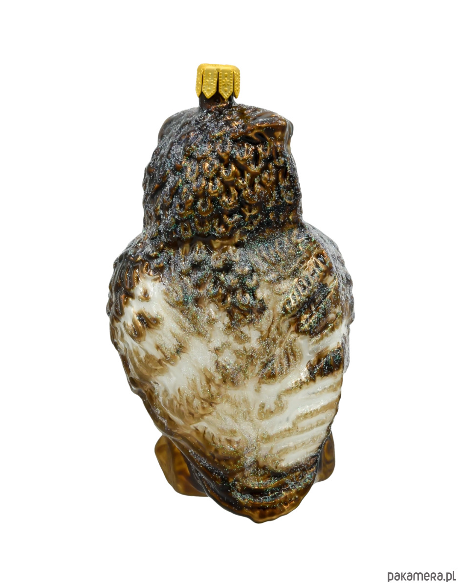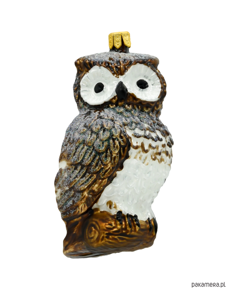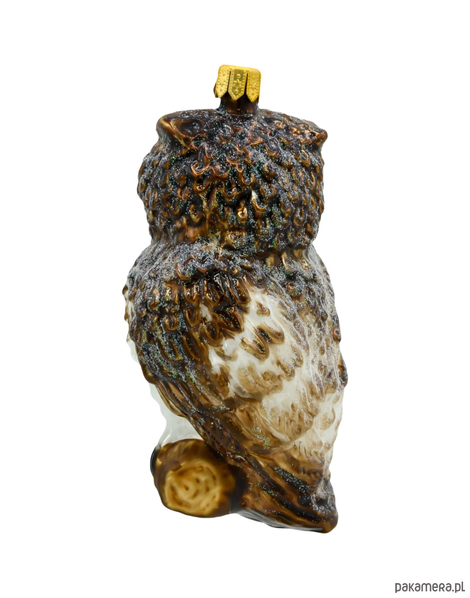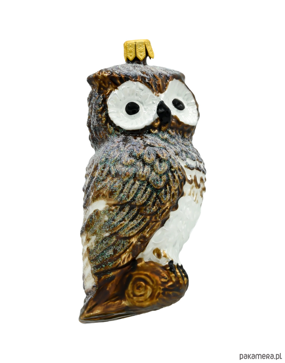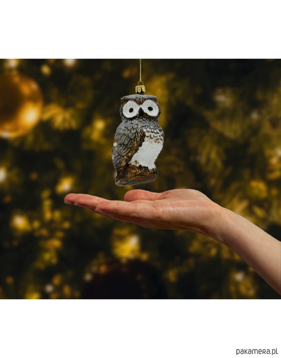 Dodaj odrobinę leśnej magii do swojej choinki dzięki tej wyjątkowej bombce w kształcie sowy. Ręcznie malowana z dbałością o każdy szczegół, bombka przedstawia realistycznie odwzorowaną sowę siedzącą na gałęzi. Jej brązowe pióra ozdobione są brokatem, który subtelnie odbija światło, nadając dekoracji elegancji i blasku. Wielkie, charakterystyczne oczy i wyraziste detale głowy sprawiają, że ozdoba zachwyca naturalnością i kunsztem wykonania.