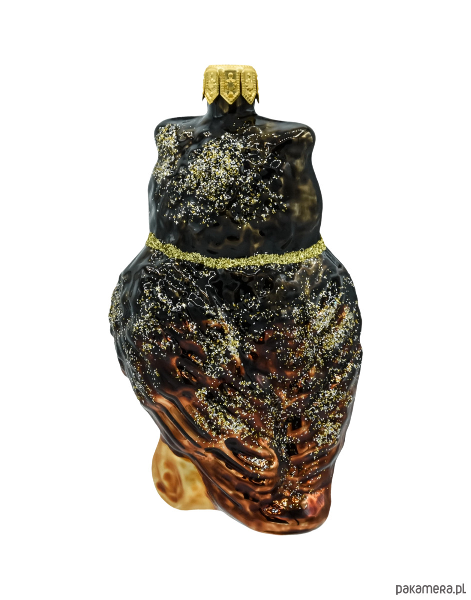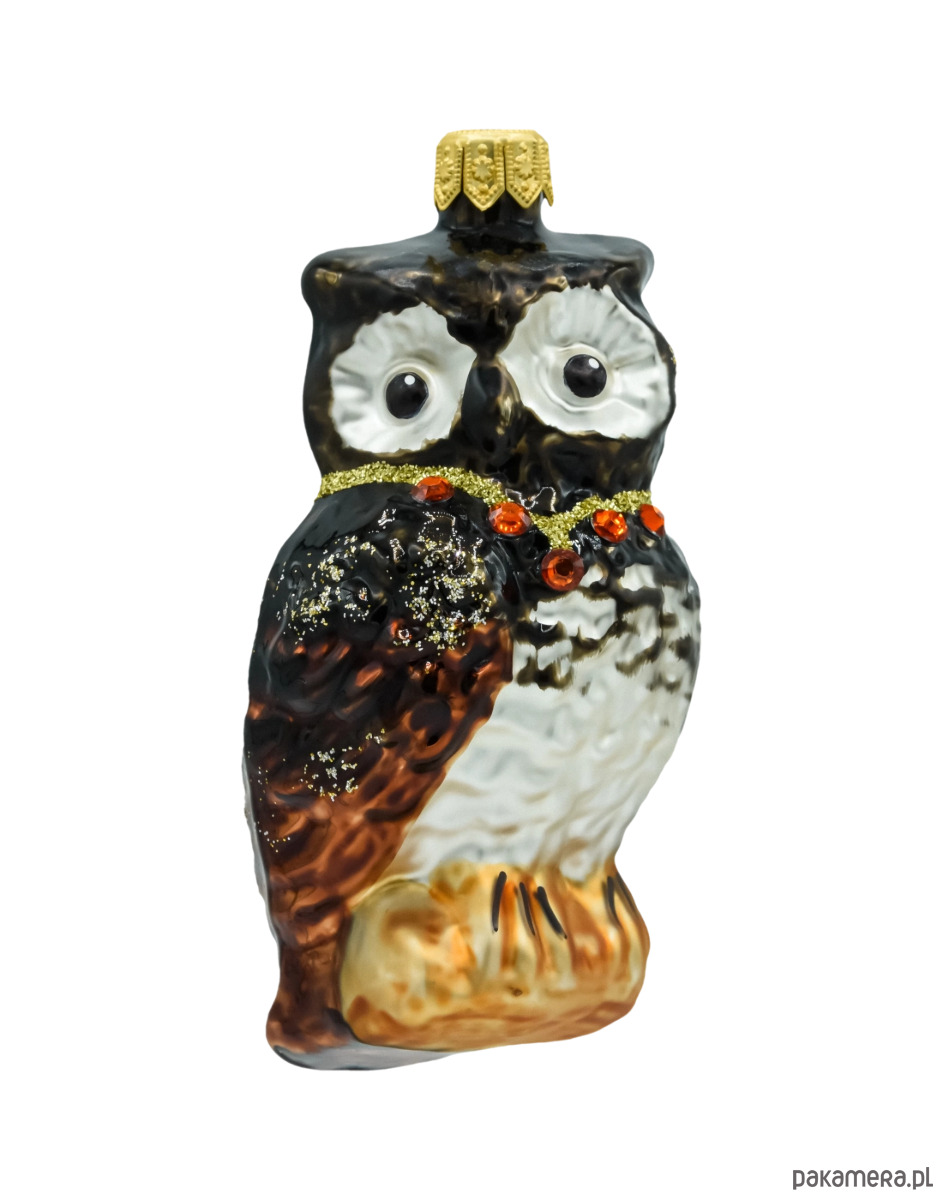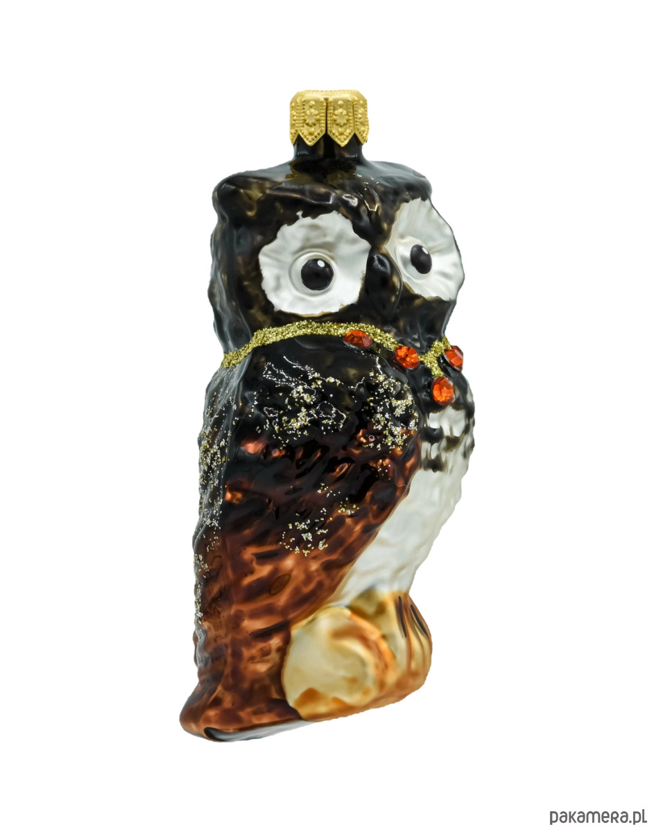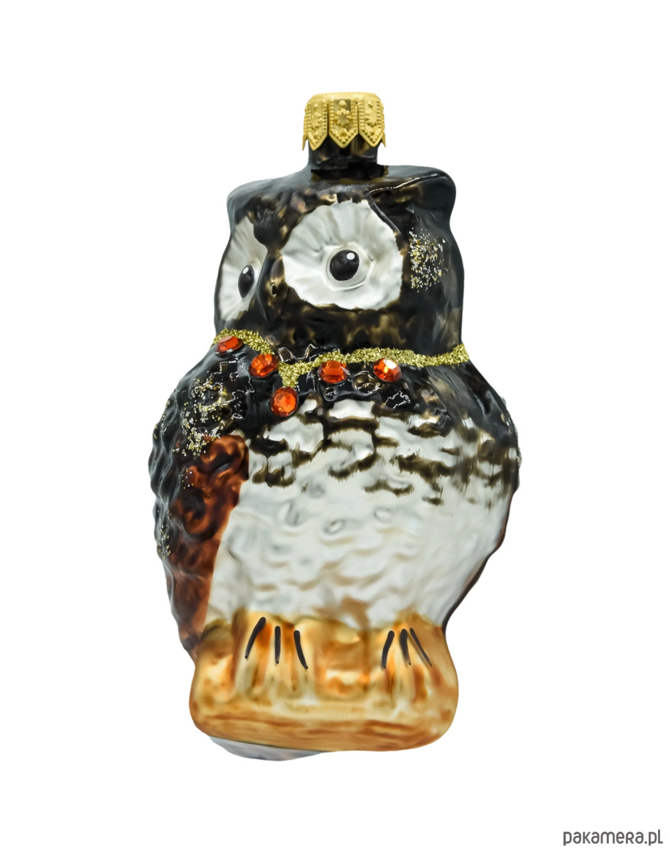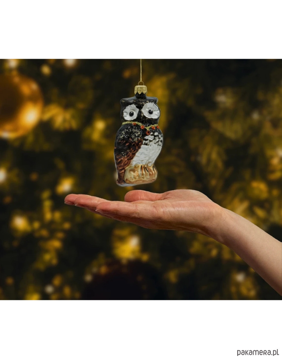 Szklana figurka sowy została wykonana z najwyższej jakości szkła dmuchanego, co czyni każdą sztukę unikalnym dziełem sztuki. Ciemnobrązowe pióra z nutą miedzianego połysku, wyraziste oczy i ozdobny, złoto-czerwony naszyjnik z brokatu i kamyczków sprawiają, że bombka wygląda niezwykle efektownie zarówno na zielonej choince, jak i jako niezależna dekoracja świąteczna. To doskonały wybór dla miłośników natury, ptaków oraz motywów leśnych w wystroju wnętrz.
