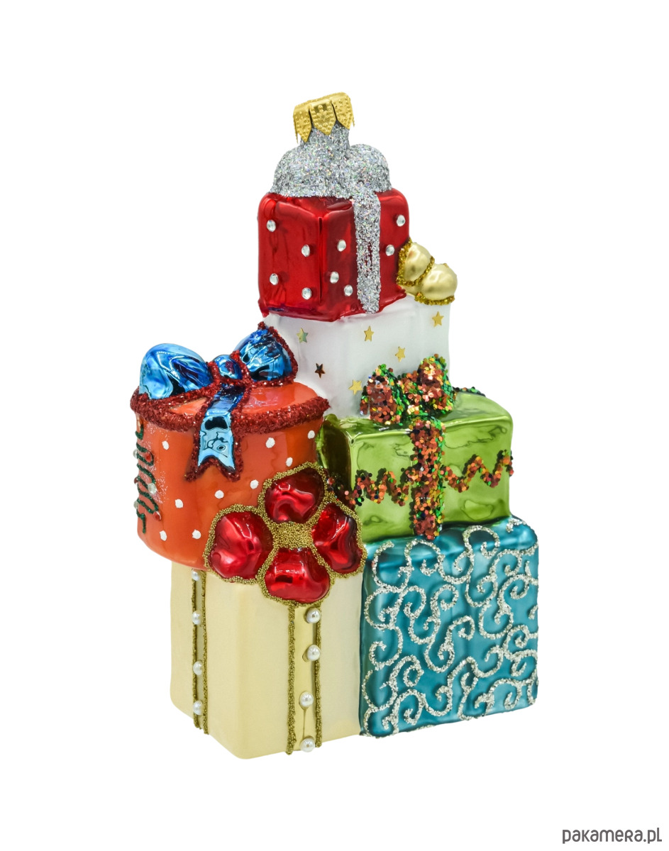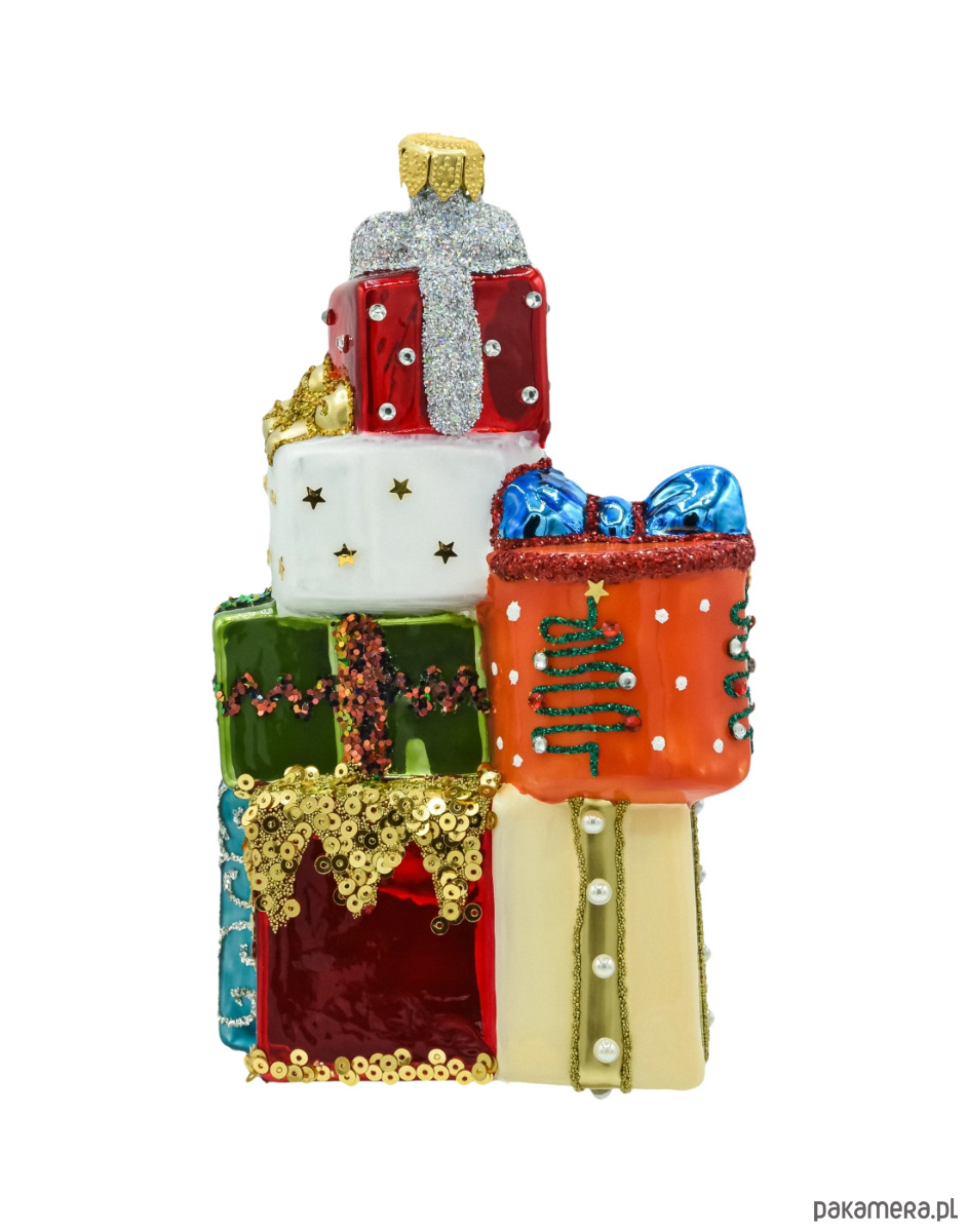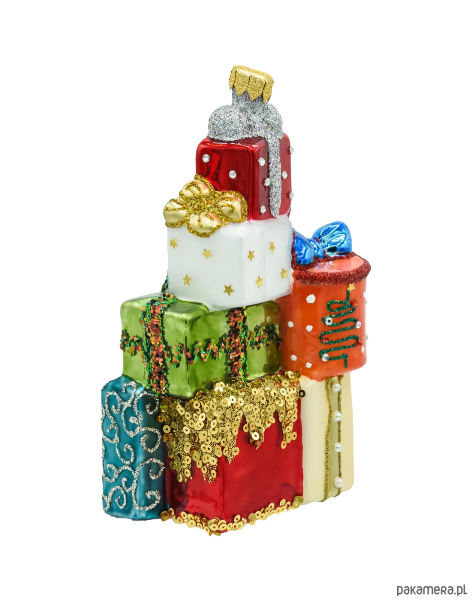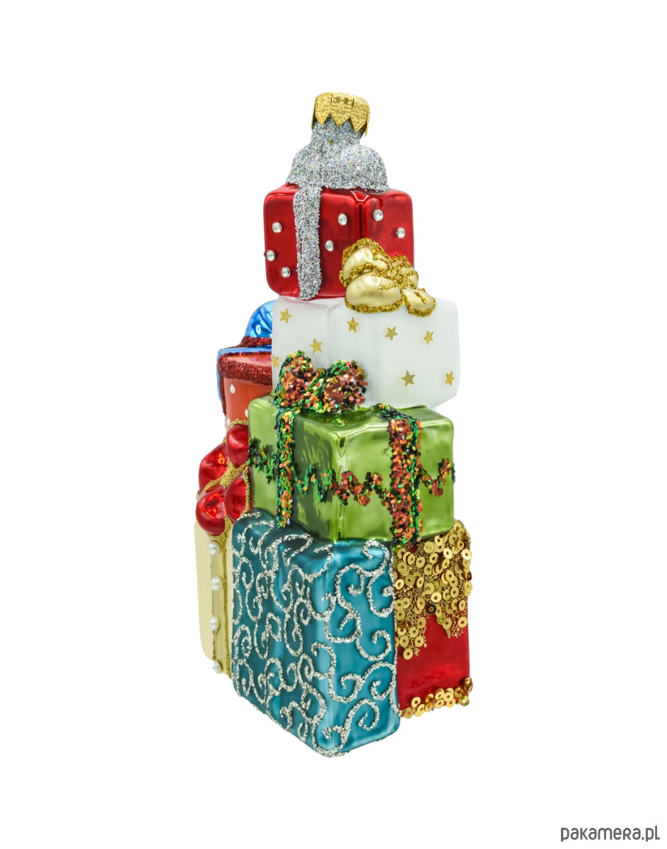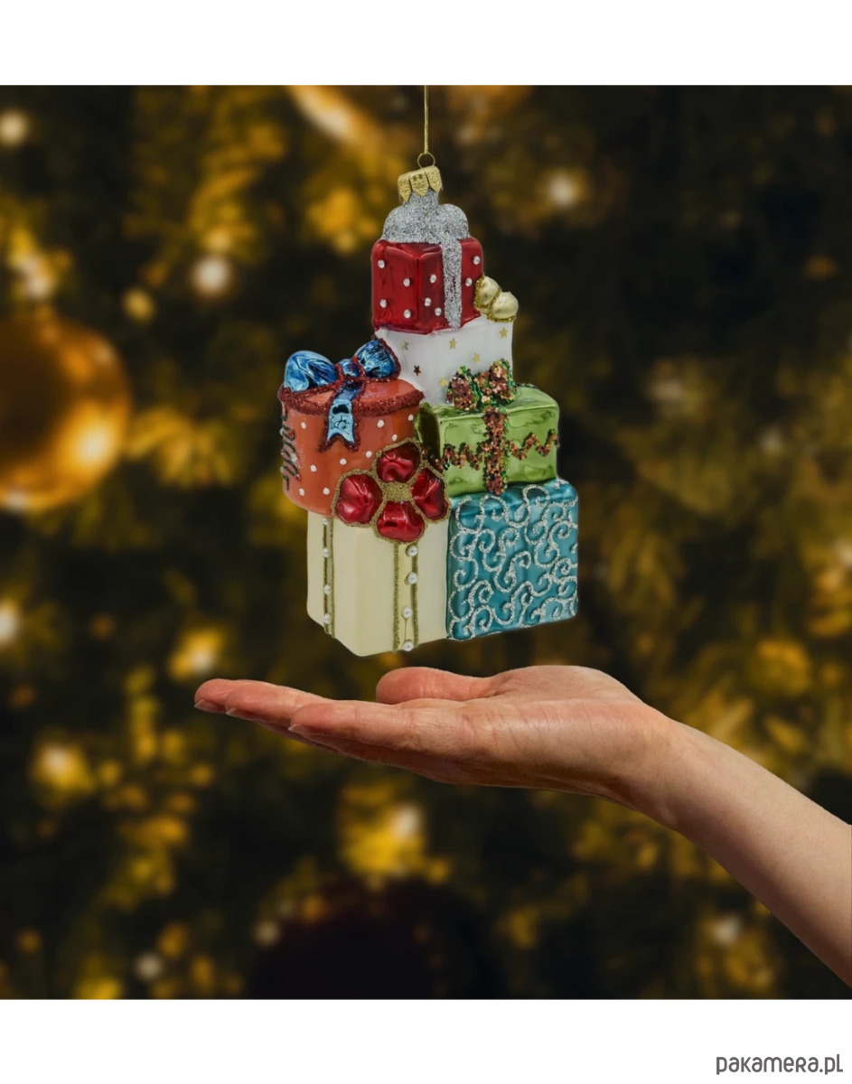 Wprowadź na choinkę odrobinę prawdziwej świątecznej magii! Ta efektowna bombka szklana w formie stosu prezentów zachwyca bogactwem kolorów i detali: od czerwieni i zieleni po turkus i krem, a wszystko podkreślone złotymi ornamentami, brokatem, cekinami oraz perełkami. Wielowarstwowa kompozycja pudełek przewiązanych różnymi kokardami tworzy przestrzenną, trójwymiarową ozdobę, która przyciąga wzrok z każdego miejsca choinki.