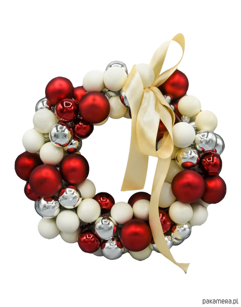 Wprowadź do swojego wnętrza odrobinę klasycznej magii Świąt dzięki efektownej dekoracji w postaci wieńca wykonanego ze szklanych bombek. Kompozycja w ponadczasowej palecie czerwieni, śnieżnej bieli i eleganckiego srebra przyciąga wzrok i doskonale wpisuje się zarówno w tradycyjny, jak i nowoczesny wystrój bożonarodzeniowy.