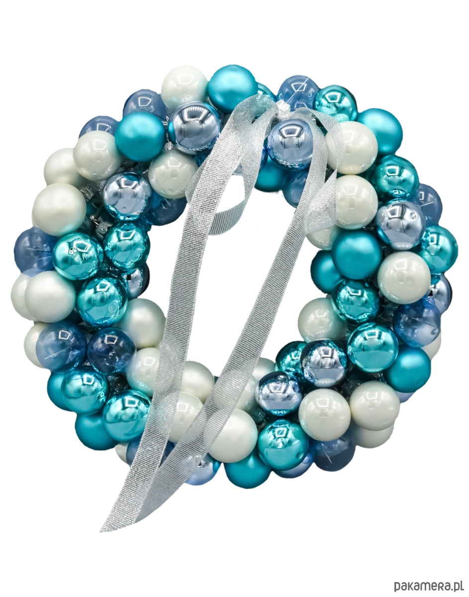 Stylowy i efektowny wieniec bożonarodzeniowy, stworzony z kilkudziesięciu szklanych bombek o średnicy 30 mm, to propozycja dla osób ceniących nowoczesną elegancję w świątecznym wystroju. Kompozycja w odcieniach lodowego błękitu, perłowej bieli, metalicznego turkusu i połyskującego srebra tworzy harmonijną całość, idealną do powieszenia na drzwiach, ścianie lub kominku.