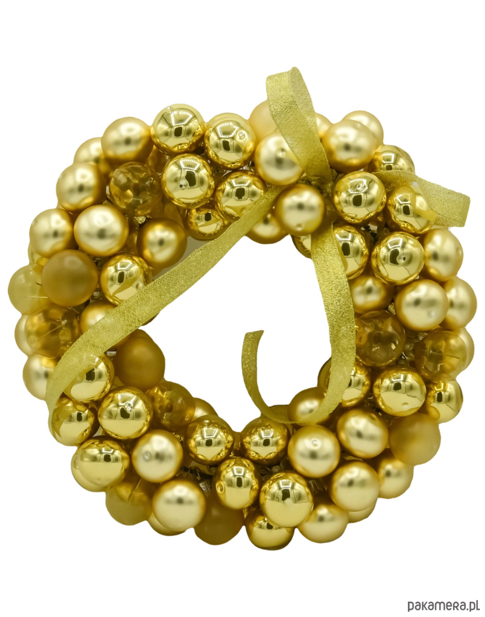 Ten elegancki wieniec świąteczny został wykonany z kilkudziesięciu efektownych bombek o średnicy 30 mm, tworząc efektowną i harmonijną kompozycję w odcieniach szlachetnego złota. To wyjątkowa dekoracja, która wniesie do wnętrza blask, styl i świąteczną atmosferę.