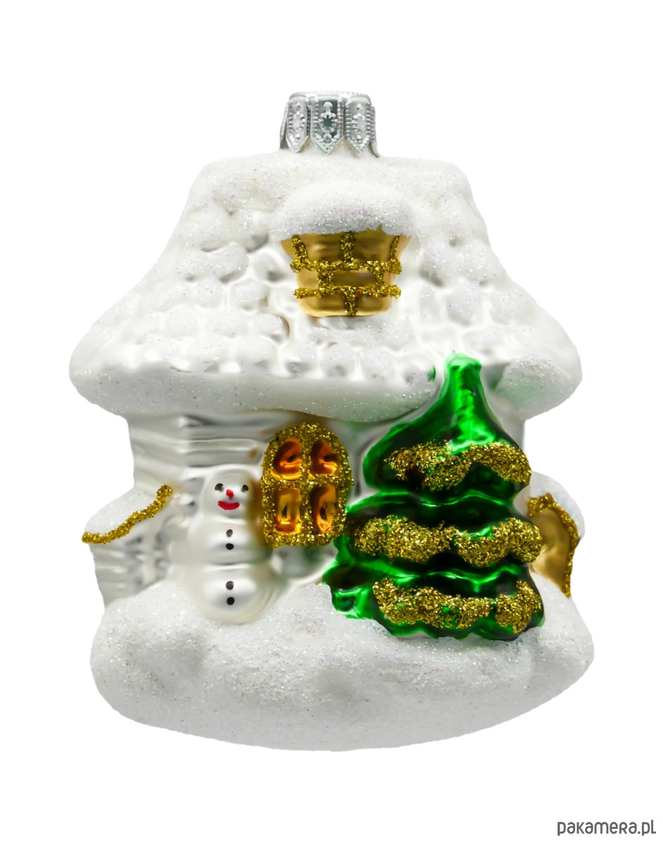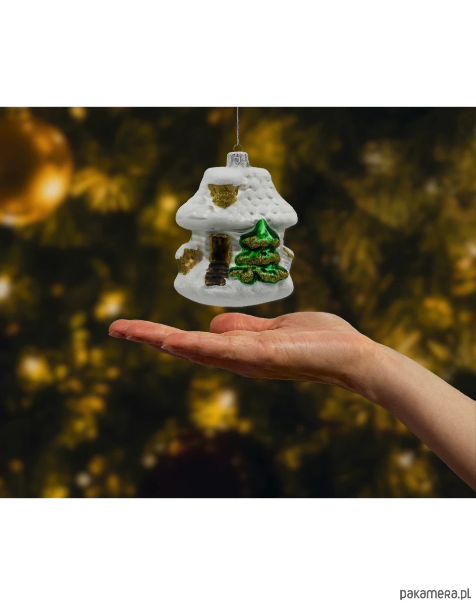Design: Bombka przedstawia zimowy domek otulony śniegiem, z bogatymi złotymi akcentami i zieloną choinką ozdobioną złotymi detalami. Starannie odwzorowane detale nadają jej realistycznego i magicznego wyglądu.