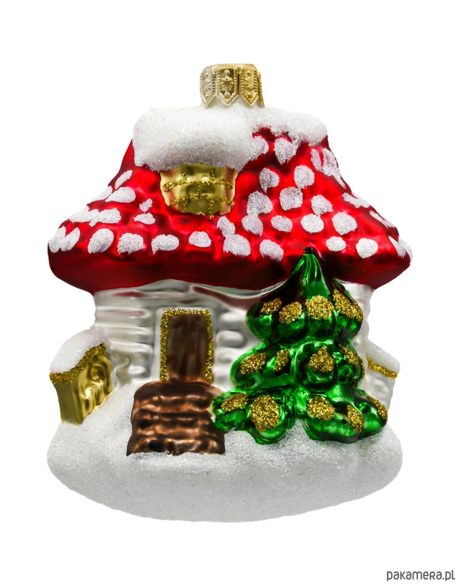 Design: Bombka przedstawia zimowy domek otulony śniegiem, z bogatymi złotymi akcentami i zieloną choinką ozdobioną złotymi detalami. Starannie odwzorowane detale nadają jej realistycznego i magicznego wyglądu.