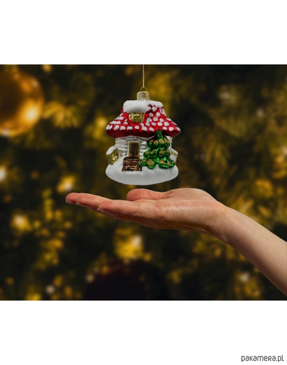 Świąteczny klimat w Twoim domu: Bombka z motywem zimowego domku z choinką wprowadza ciepły, świąteczny nastrój, idealnie komponując się z innymi ozdobami bożonarodzeniowymi.