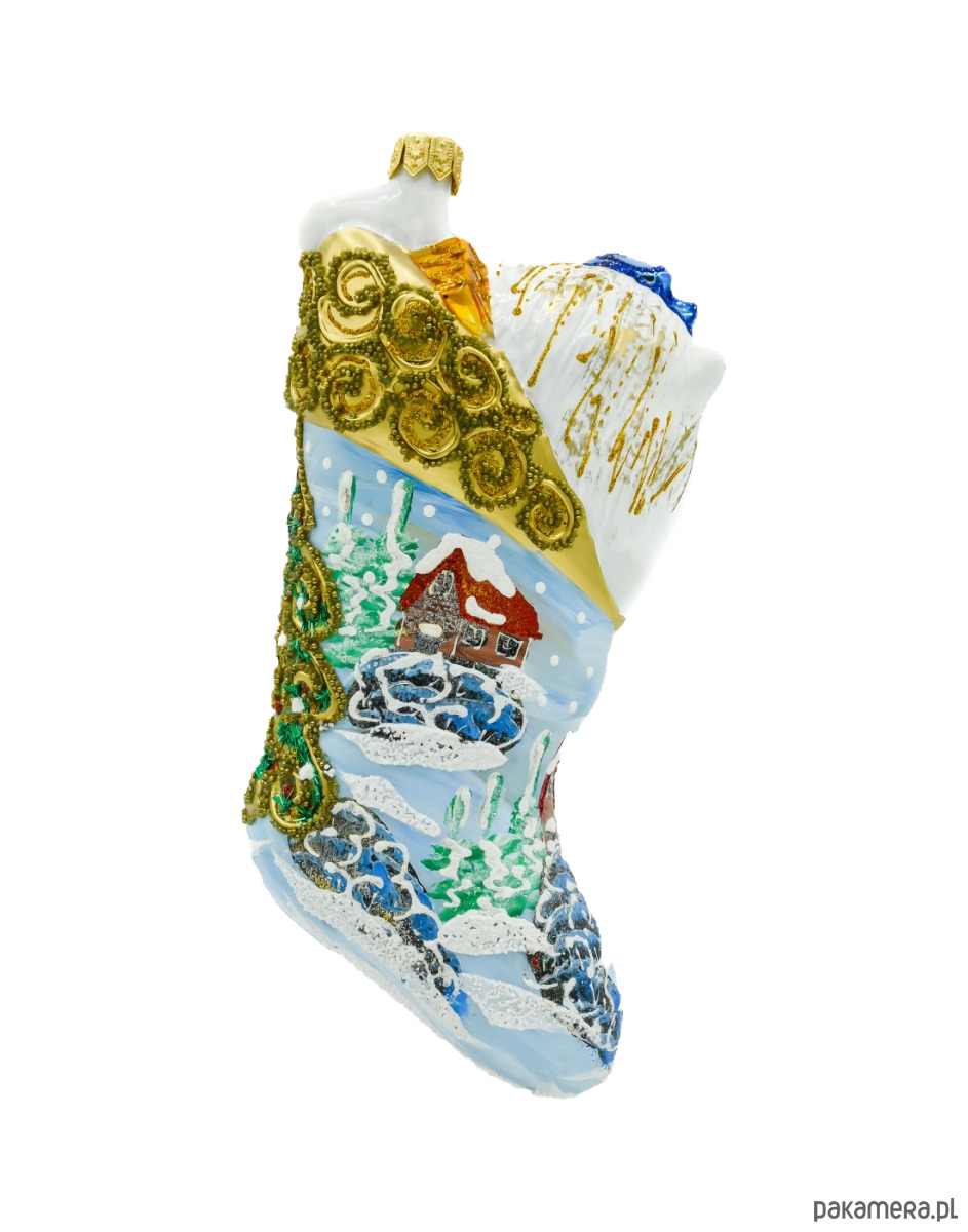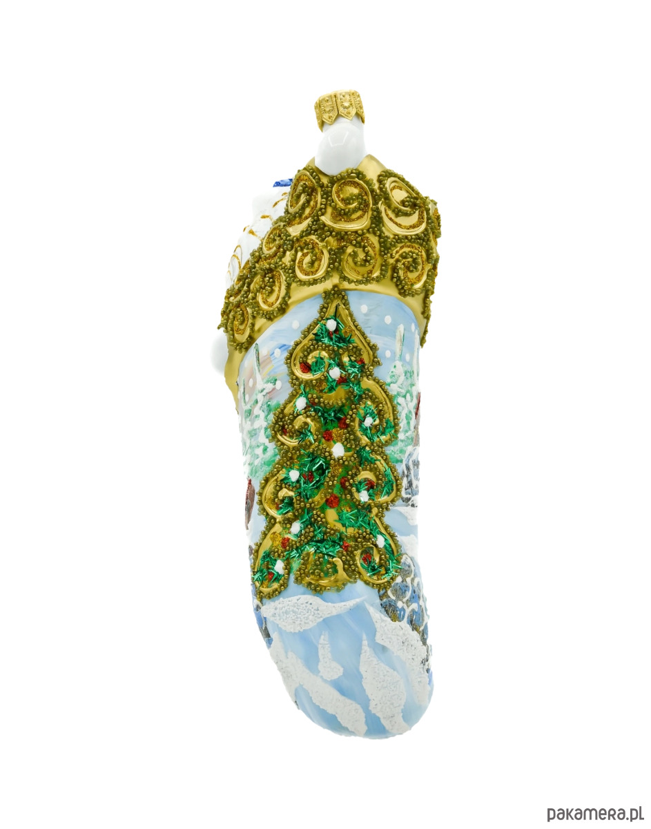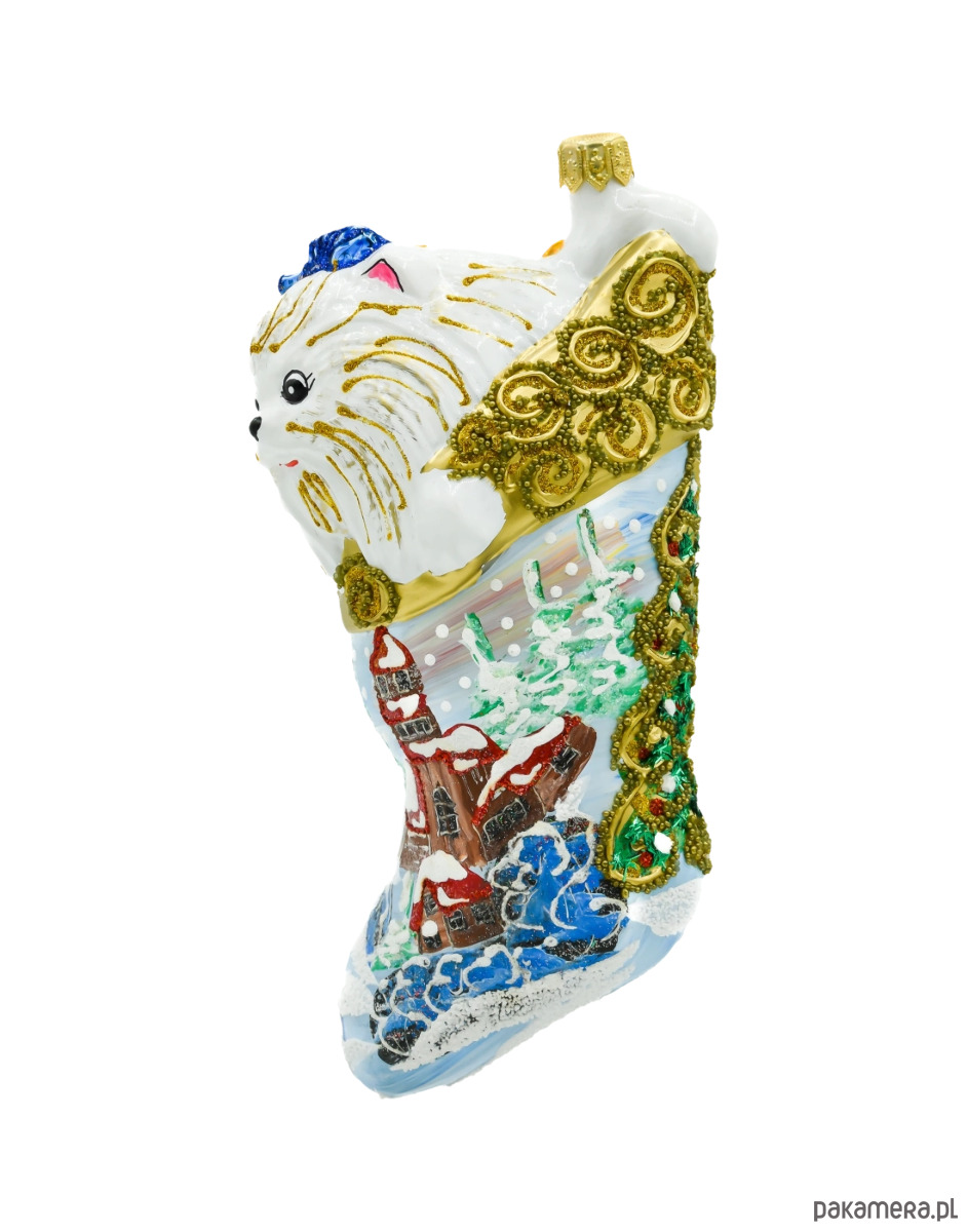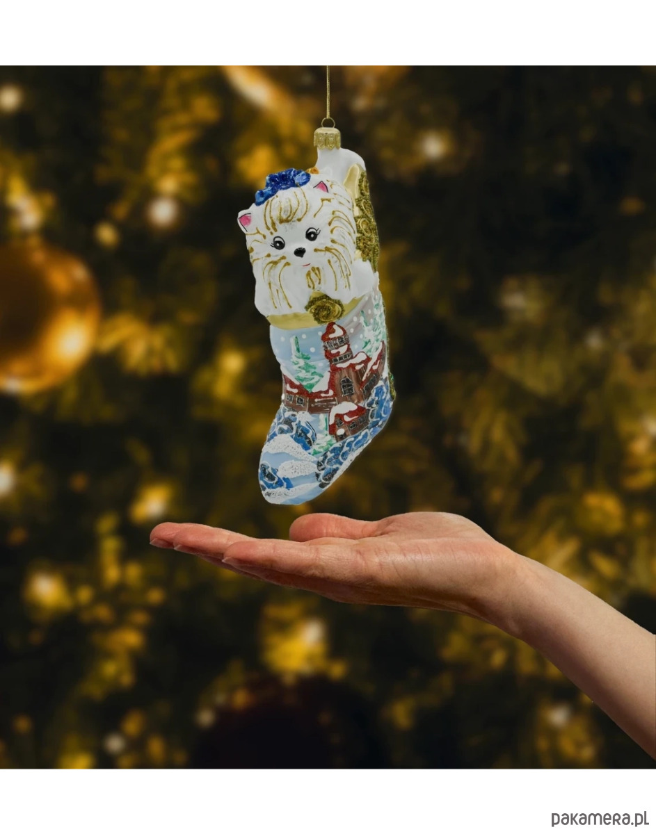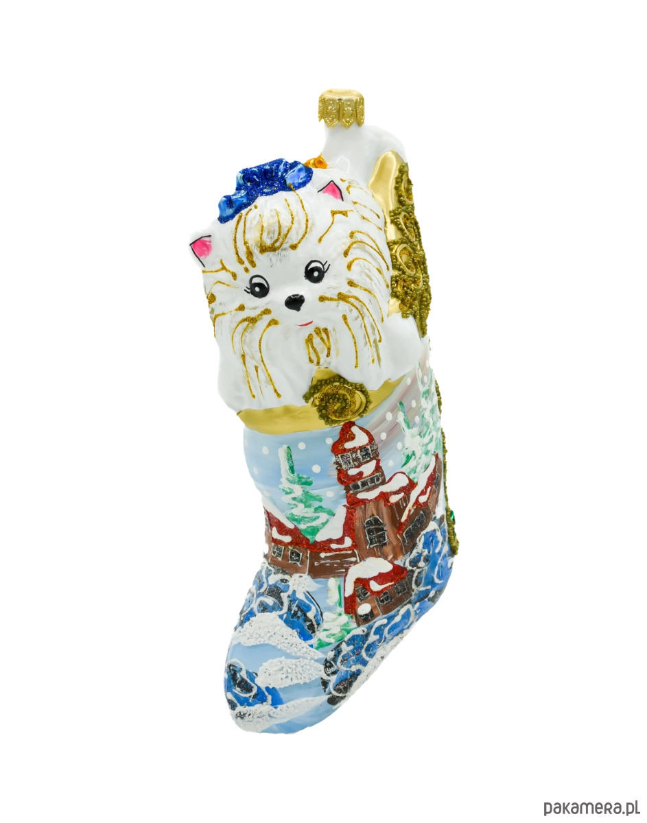 Szklana bombka „Świąteczna skarpeta z pieskiem” to prawdziwe arcydzieło ręcznego rzemiosła. Dzięki swojemu unikalnemu wzornictwu, luksusowym zdobieniom