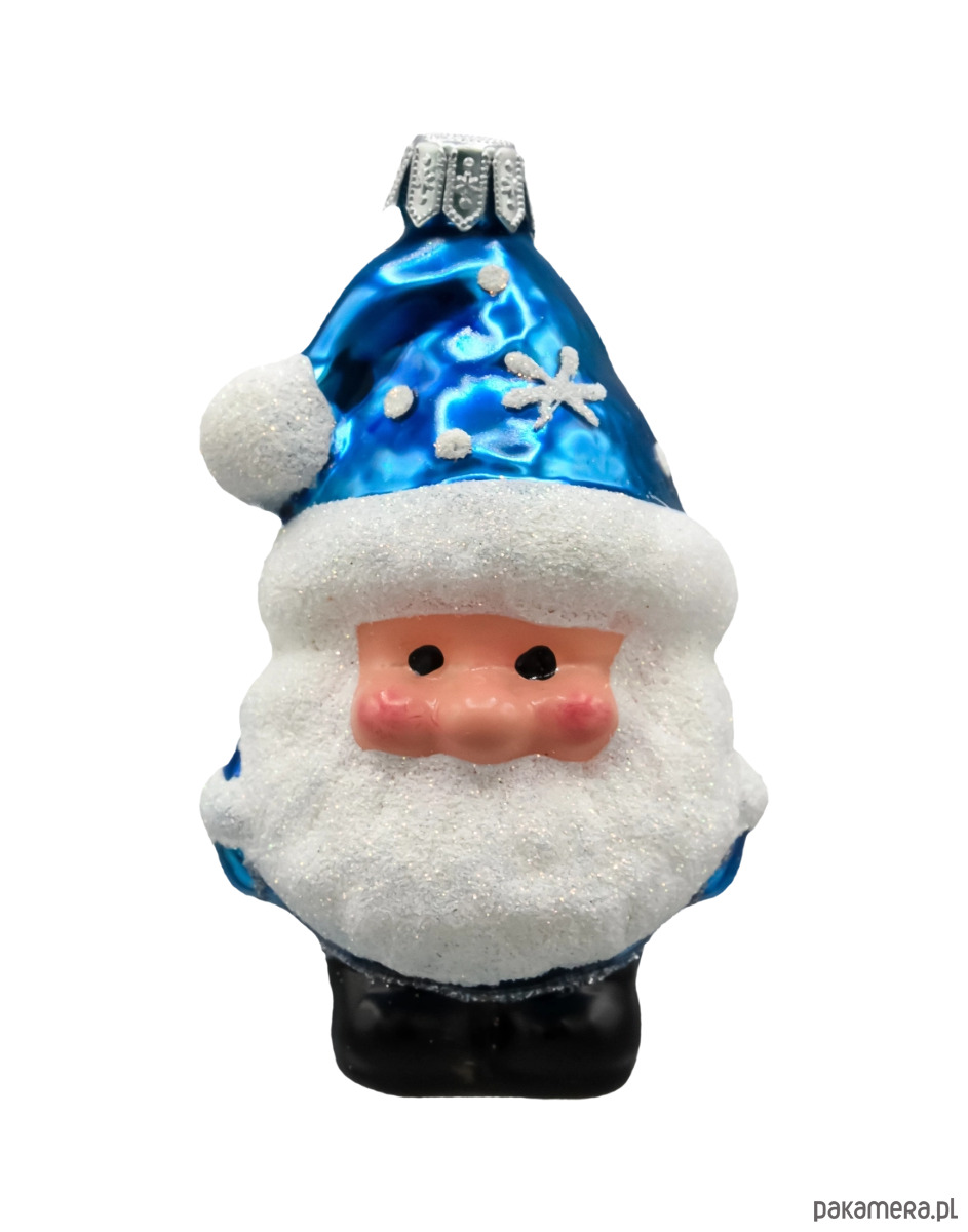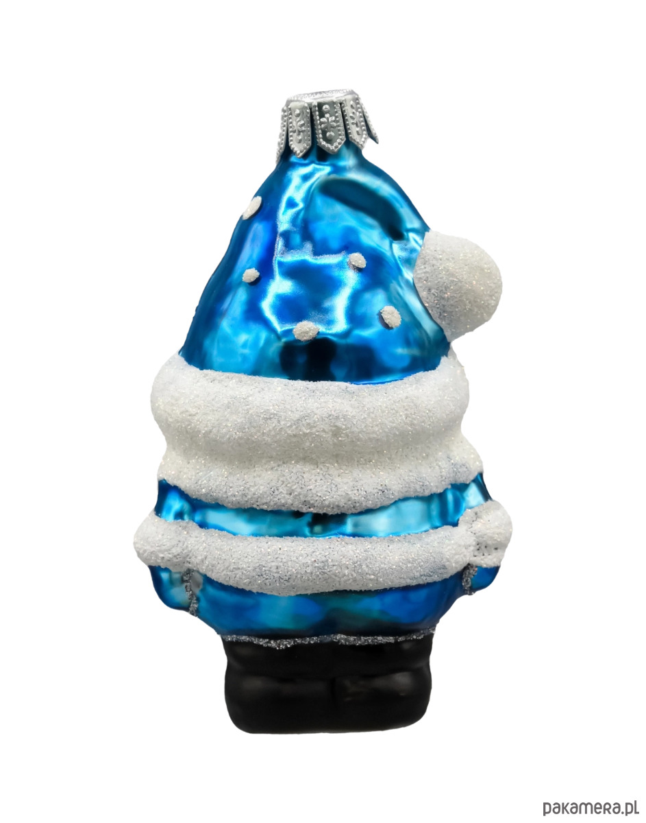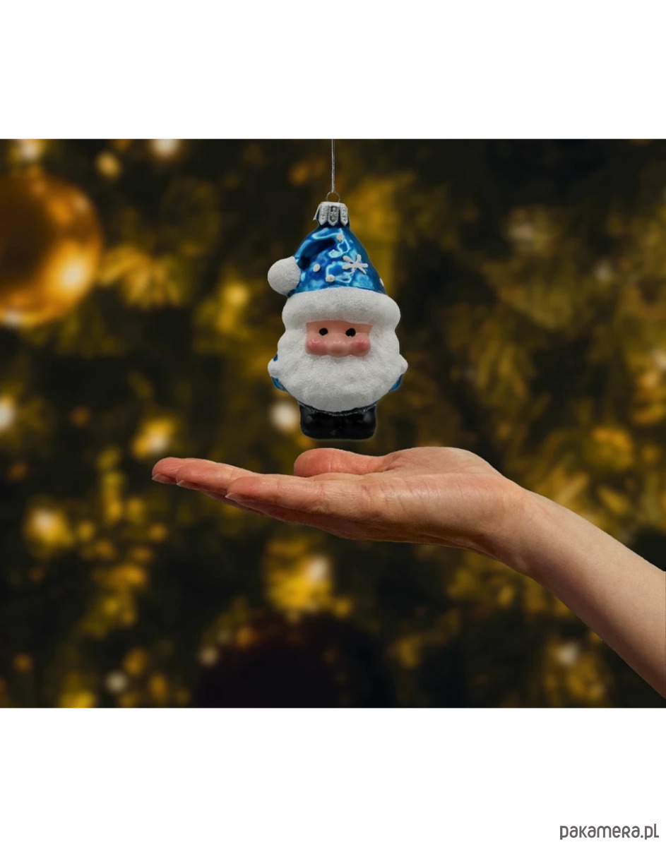 Postać Mikołaja skrzata przykuwa uwagę wyrazistą, dziecięcą buzią z rumieńcami oraz gęstą, białą brodą wykonaną z iskrzącego brokatu. Jego szpiczasta czapka w intensywnym błękicie ozdobiona jest brokatowymi płatkami śniegu, które nadają bombce świąteczny, bajkowy charakter. Całość uzupełniają czarne buciki oraz srebrna koronka u góry, umożliwiająca zawieszenie ozdoby na choince.