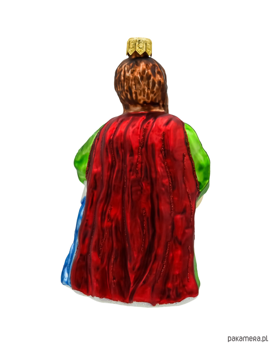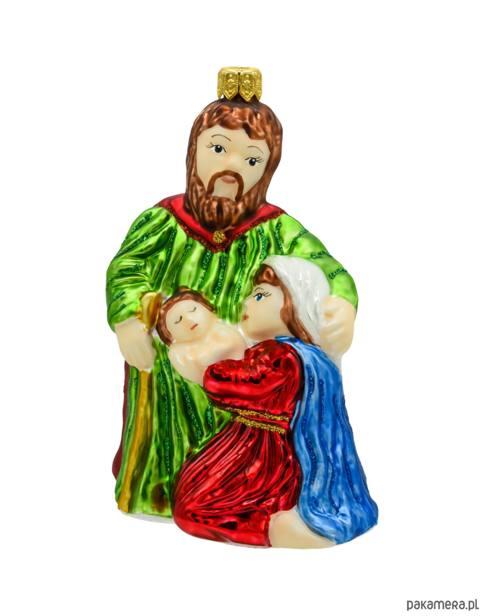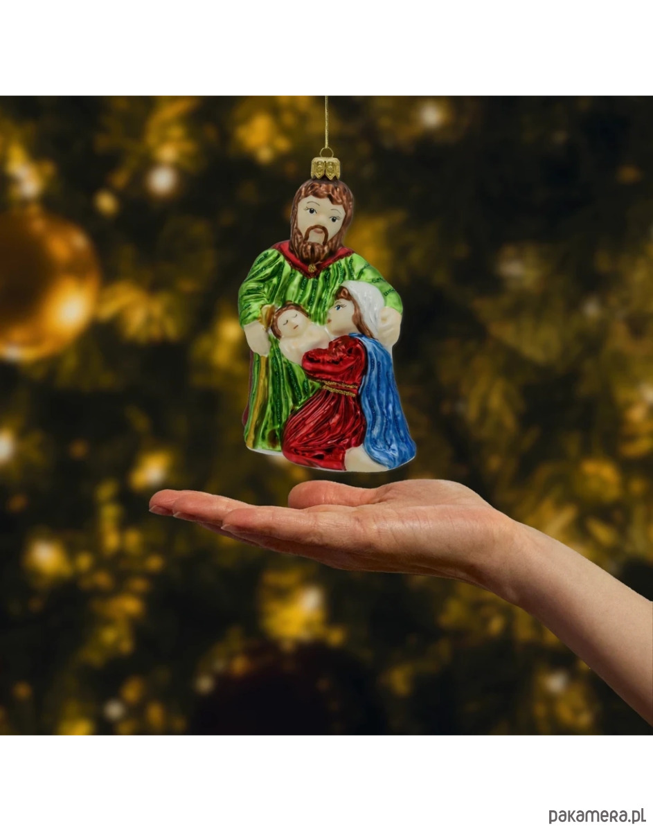 Bombka wykonana jest z dmuchanego szkła i ręcznie malowana intensywnymi, żywymi kolorami – szatę Józefa zdobi zielony brokat, suknia Maryi lśni głęboką czerwienią, a jej niebieski płaszcz symbolizuje czystość i niebiańską ochronę. Całość została wykończona złotymi akcentami, które pięknie odbijają światło choinkowych lampek.