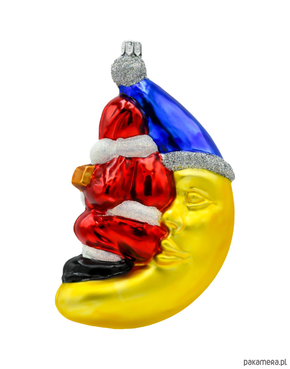 Kolorowa estetyka – intensywna czerwień stroju Mikołaja, złoty księżyc i niebieski worek przyciągają wzrok i wprowadzają radosny klimat.