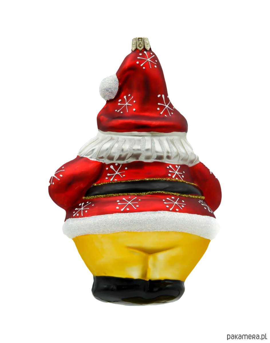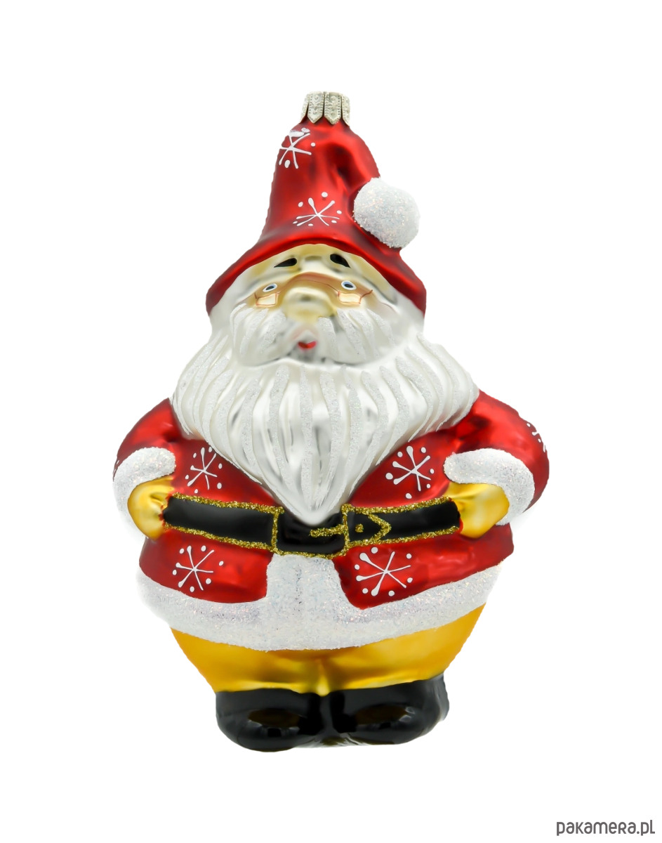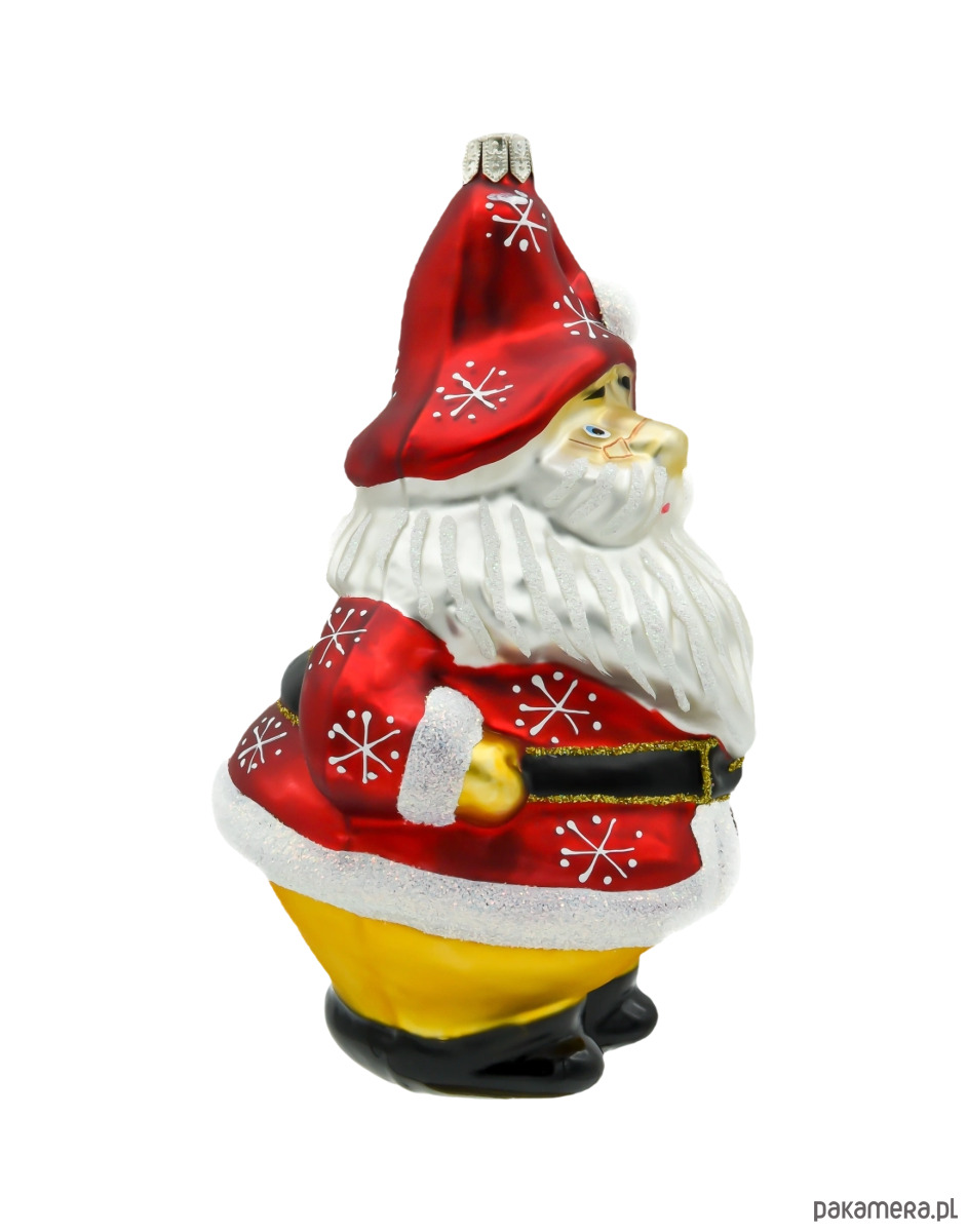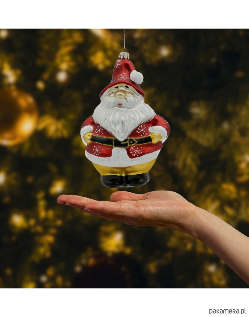 Design Świętego Mikołaja: Bombka przedstawia uśmiechniętego Świętego Mikołaja w klasycznym, czerwonym stroju ozdobionym białymi śnieżynkami. Święty Mikołaj trzyma pas i jest udekorowany subtelnym brokatem, co dodaje mu świątecznego blasku. Jego bujna biała broda oraz charakterystyczna czapka sprawiają, że bombka jest rozpoznawalnym symbolem świąt.