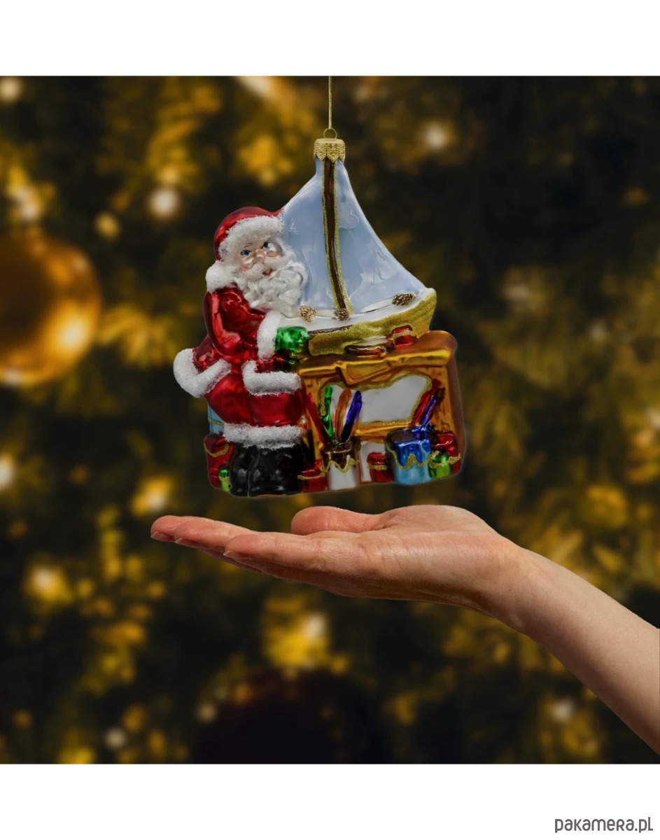 Wprowadź do świątecznego wystroju nutę bajkowej magii dzięki tej wyjątkowej szklanej bombce przedstawiającej Świętego Mikołaja pracującego przy stole nad żaglówką. Każdy detal tej dekoracji został starannie dopracowany – od błyszczącej czerwieni stroju Mikołaja, przez realistycznie odwzorowany stół z farbami i pędzlami, aż po delikatne, złote akcenty żaglówki. Bombka wykonana jest z dmuchanego szkła, malowanego ręcznie, z połyskującym wykończeniem i drobnymi brokatowymi zdobieniami, które pięknie odbijają światło choinkowych lampek.