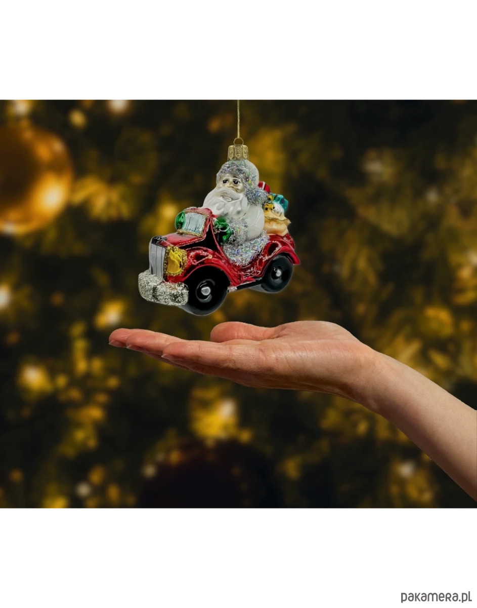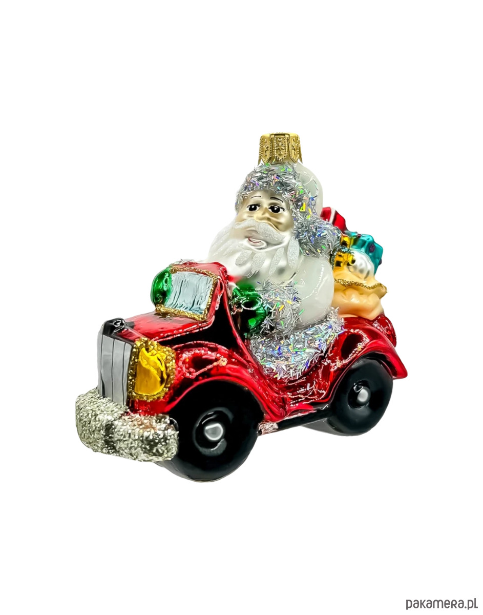 Bombka choinkowa: Święty Mikołaj w czerwonym samochodzie z prezentami