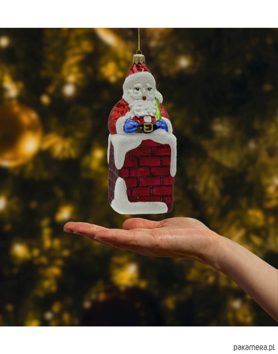 Mikołaj, z jego sympatyczną twarzą, białą brodą i charakterystycznym czerwonym strojem, przypomina magiczne chwile z dzieciństwa, kiedy to wyczekiwaliśmy prezentów. Srebrzyste detale oraz śnieżny efekt na kominie nadają bombce wyjątkowego, zimowego charakteru. Dzięki precyzji wykonania i ręcznym zdobieniom, każda bombka jest unikalnym dodatkiem do świątecznych dekoracji.