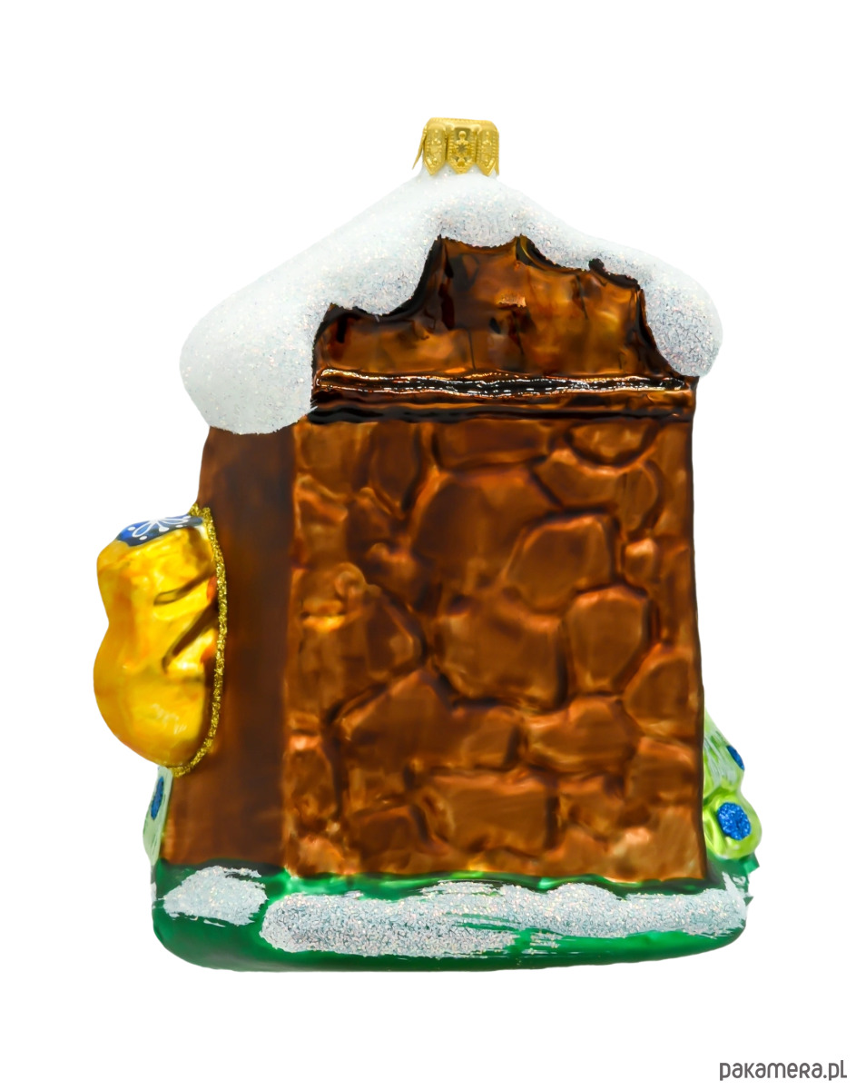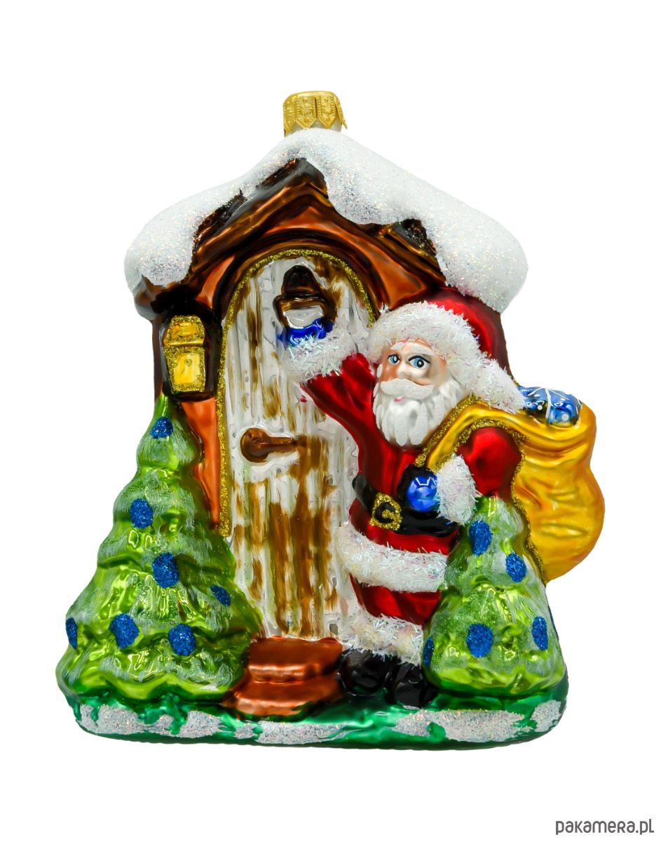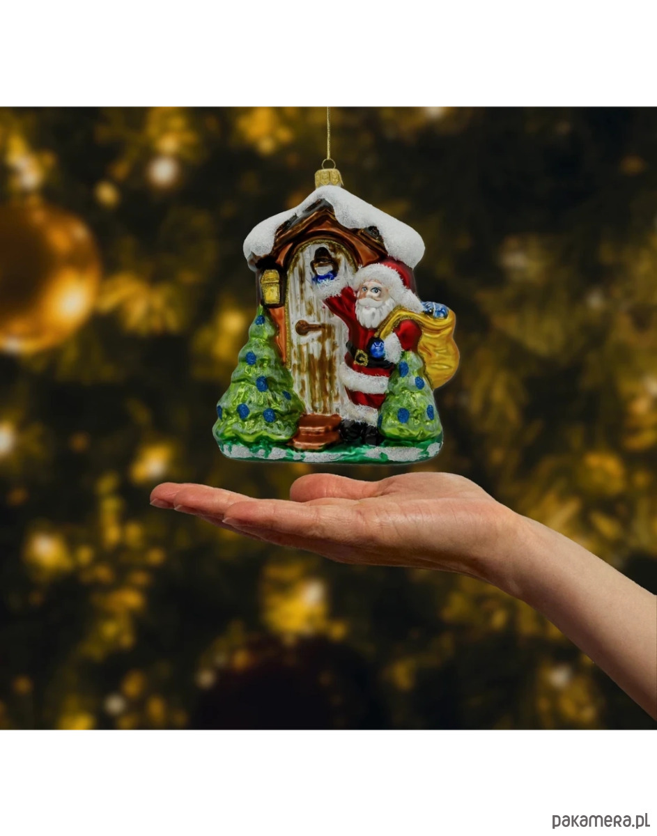 Design: Bombka przedstawia uśmiechniętego Świętego Mikołaja w czerwonym stroju, stojącego przed drzwiami drewnianego domku, otoczonego śniegiem i choinkami. Mikołaj ma na plecach złoty worek pełen prezentów, a w jego postawie można dostrzec zapowiedź nadchodzących świątecznych niespodzianek. Drewniane drzwi domku są subtelnie pokryte śniegiem, co nadaje całości uroku zimowej scenerii.