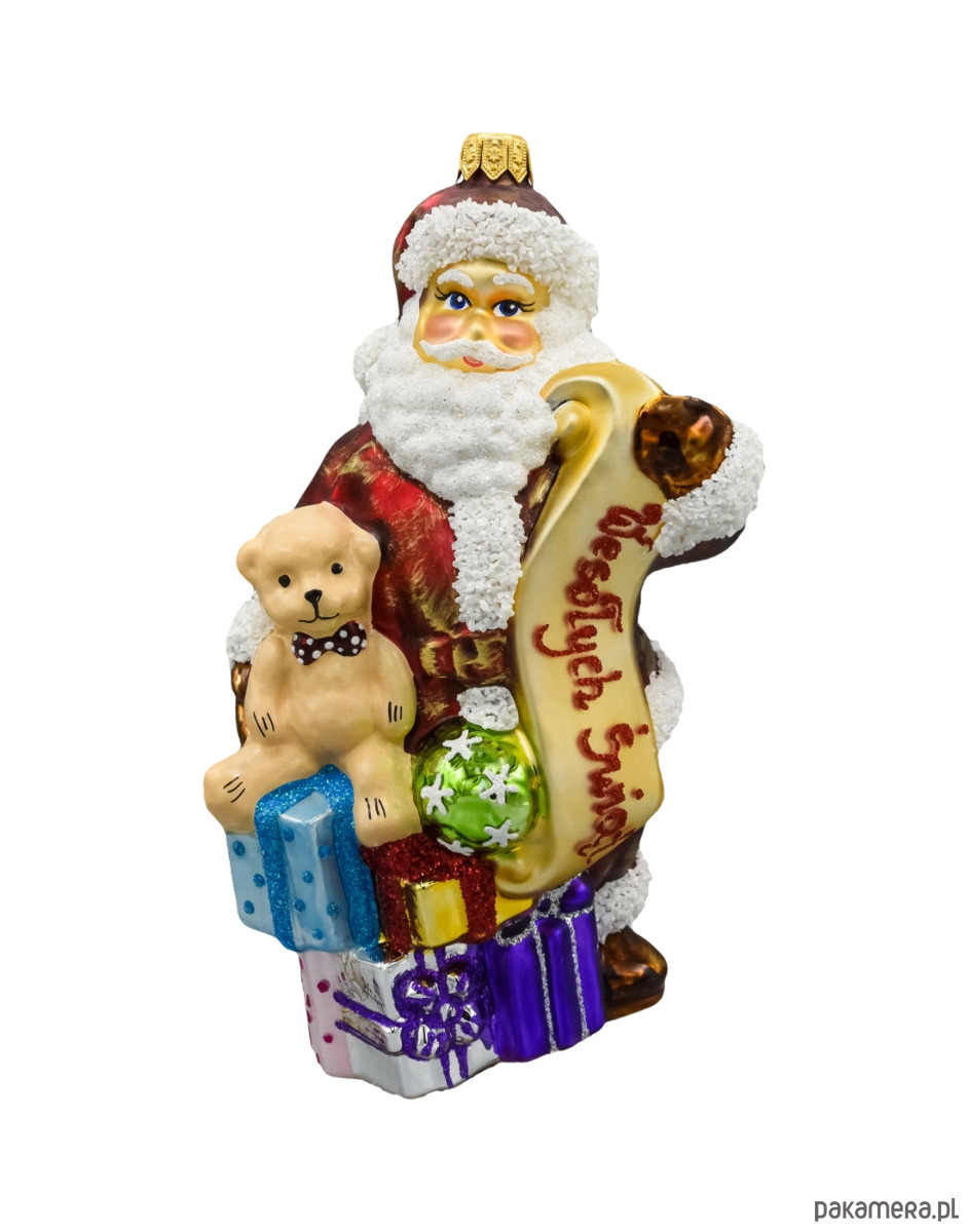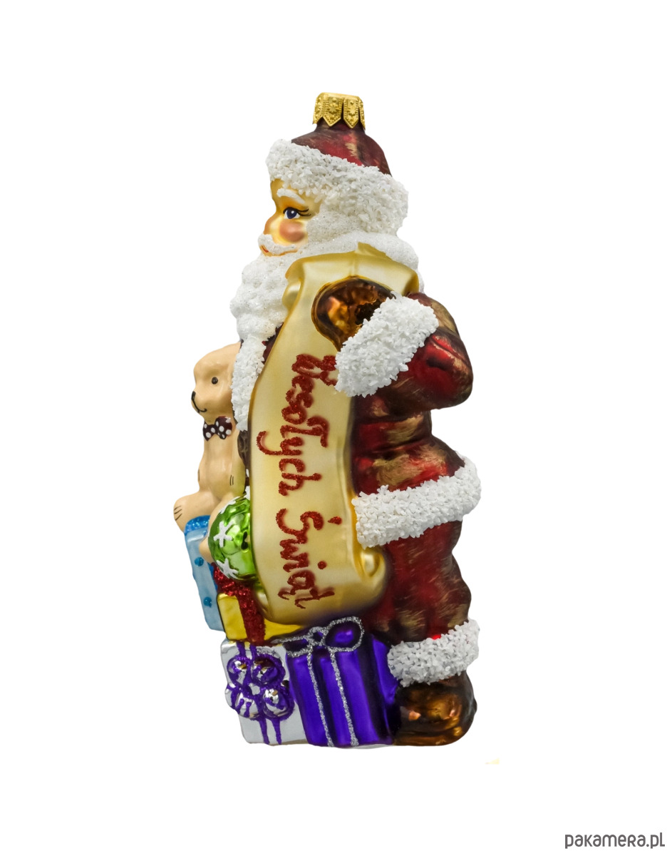 Motyw: Święty Mikołaj trzymający złoty zwój z napisem „Wesołych Świąt”, w otoczeniu prezentów, piłki i białego misia
