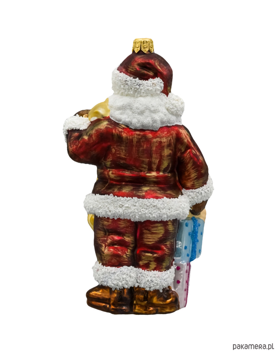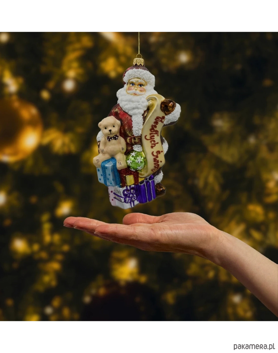 Wprowadź do swojego domu magię świąt z wyjątkową szklaną bombką przedstawiającą uśmiechniętego Świętego Mikołaja z listą prezentów i kolorowymi podarunkami. Ta ręcznie malowana ozdoba choinkowa zachwyca bogactwem detali i bajkowym charakterem – od błyszczących pudełek, przez uroczego misia i piłkę, aż po precyzyjnie zdobiony zwój z napisem „Wesołych Świąt”. Idealna dla miłośników tradycyjnych dekoracji z nutą dziecięcej radości.
