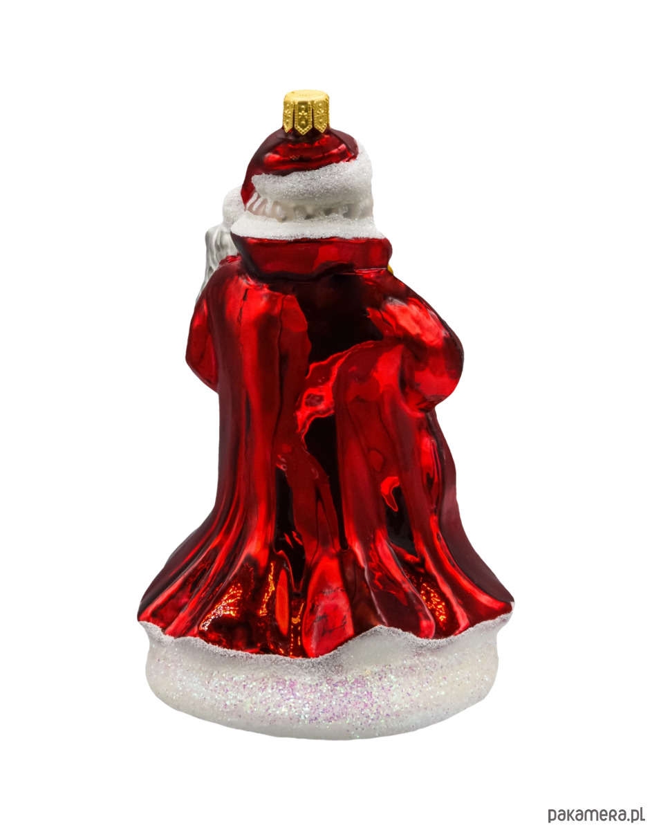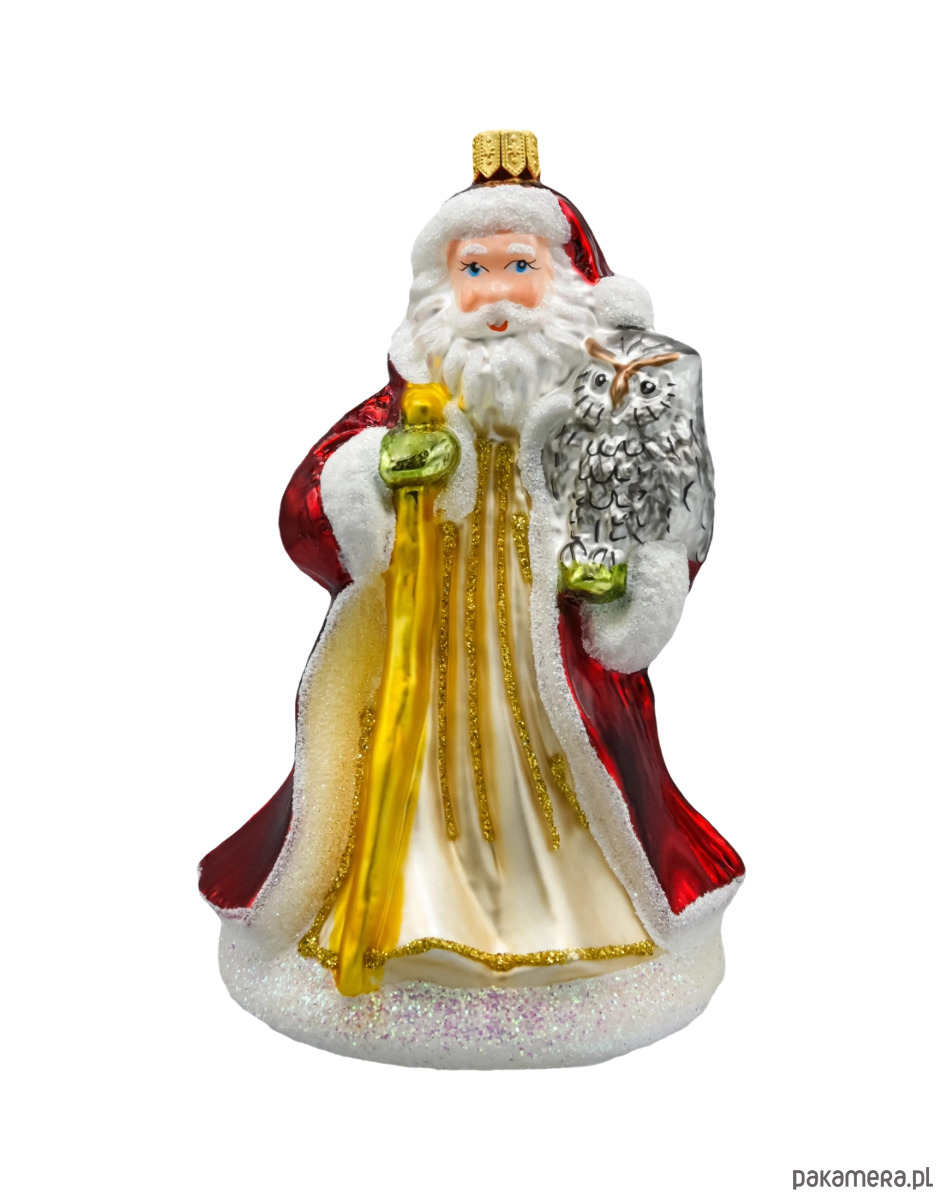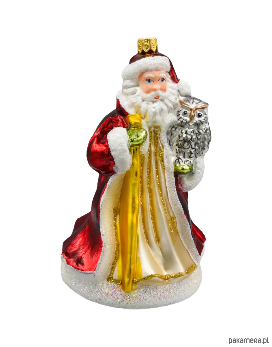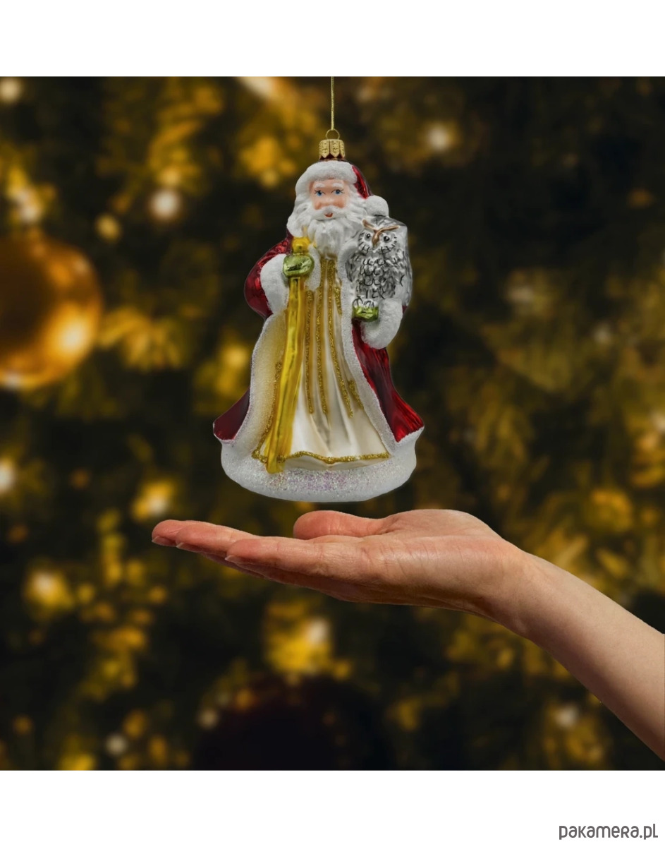 Szklana bombka choinkowa „Mikołaj z sową” to unikatowa ozdoba, która łączy świąteczną magię z nutą bajkowej mądrości. Ręcznie wykonana i precyzyjnie malowana figurka przedstawia dostojnego Świętego Mikołaja w czerwonym płaszczu obszytym białym brokatowym futerkiem. Jego postać zdobi złocista laska, a na ramieniu siedzi realistycznie odwzorowana sowa – symbol wiedzy, czujności i czarów.