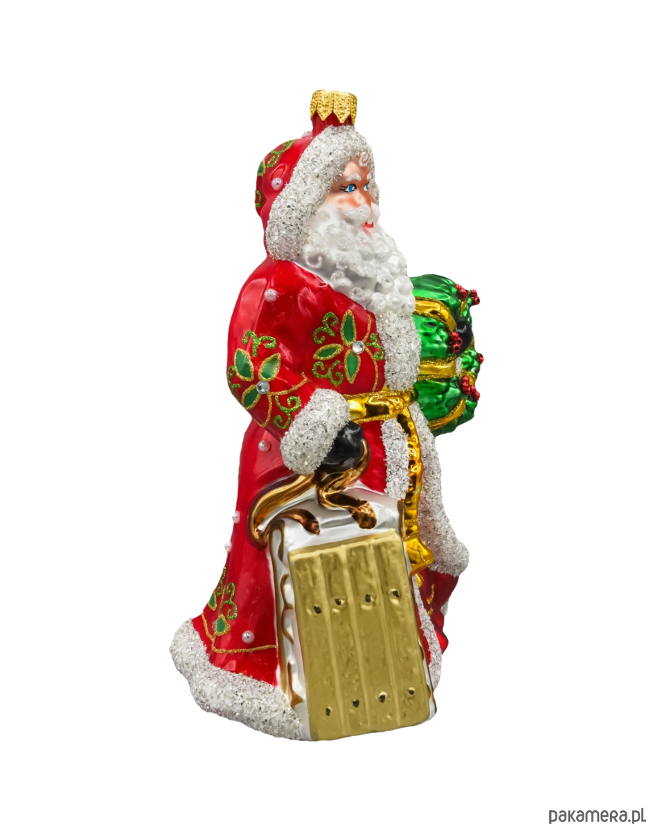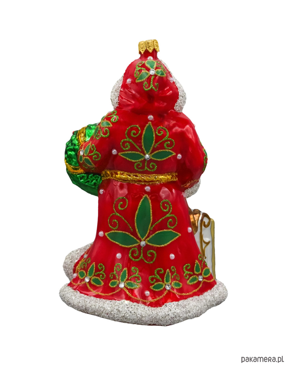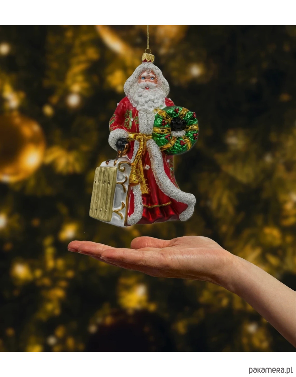 Szklana bombka choinkowa w kształcie Świętego Mikołaja z wieńcem bożonarodzeniowym i złotymi saniami to wyjątkowa ozdoba, która łączy w sobie tradycję i świąteczny blask. Ręcznie malowana i starannie zdobiona brokatem bombka zachwyca detalami – od białej, puszystej brody Mikołaja, po misterne złote sanie i soczyście zielony wieniec z czerwonymi jagodami. Czerwony płaszcz Świętego Mikołaja ozdobiono połyskującymi, brokatowymi ornamentami w odcieniach zieleni i złota, a całość uzupełnia precyzyjne wykończenie futerkiem i perłowymi akcentami.