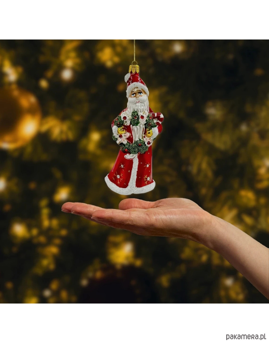 W rękach Mikołaja znajduje się starannie zdobiony wieniec świąteczny, pełen zielonych gałązek, złotych i czerwonych bombek oraz delikatnych kwiatowych akcentów. Ta ozdoba dodaje bombce elegancji i unikalności.