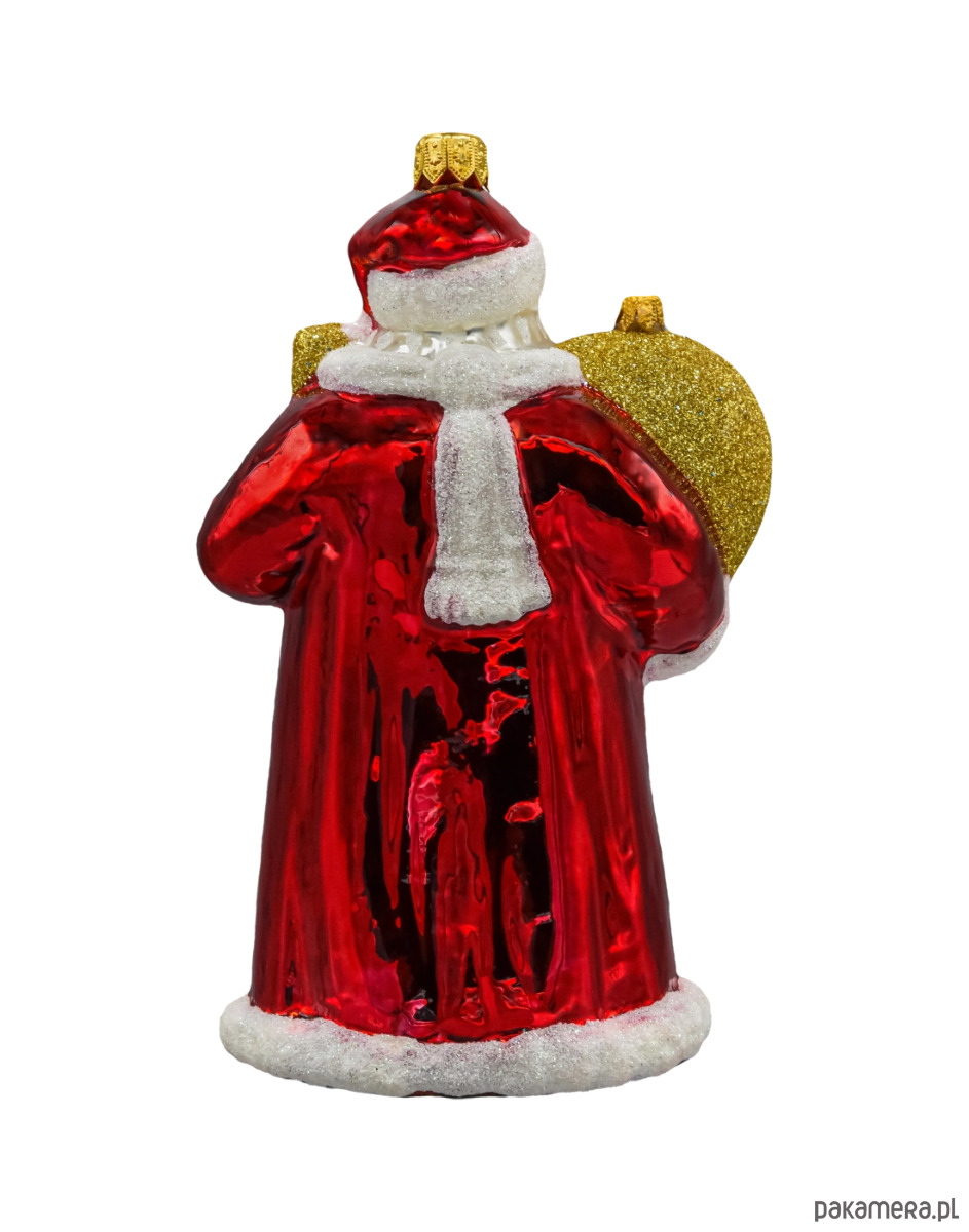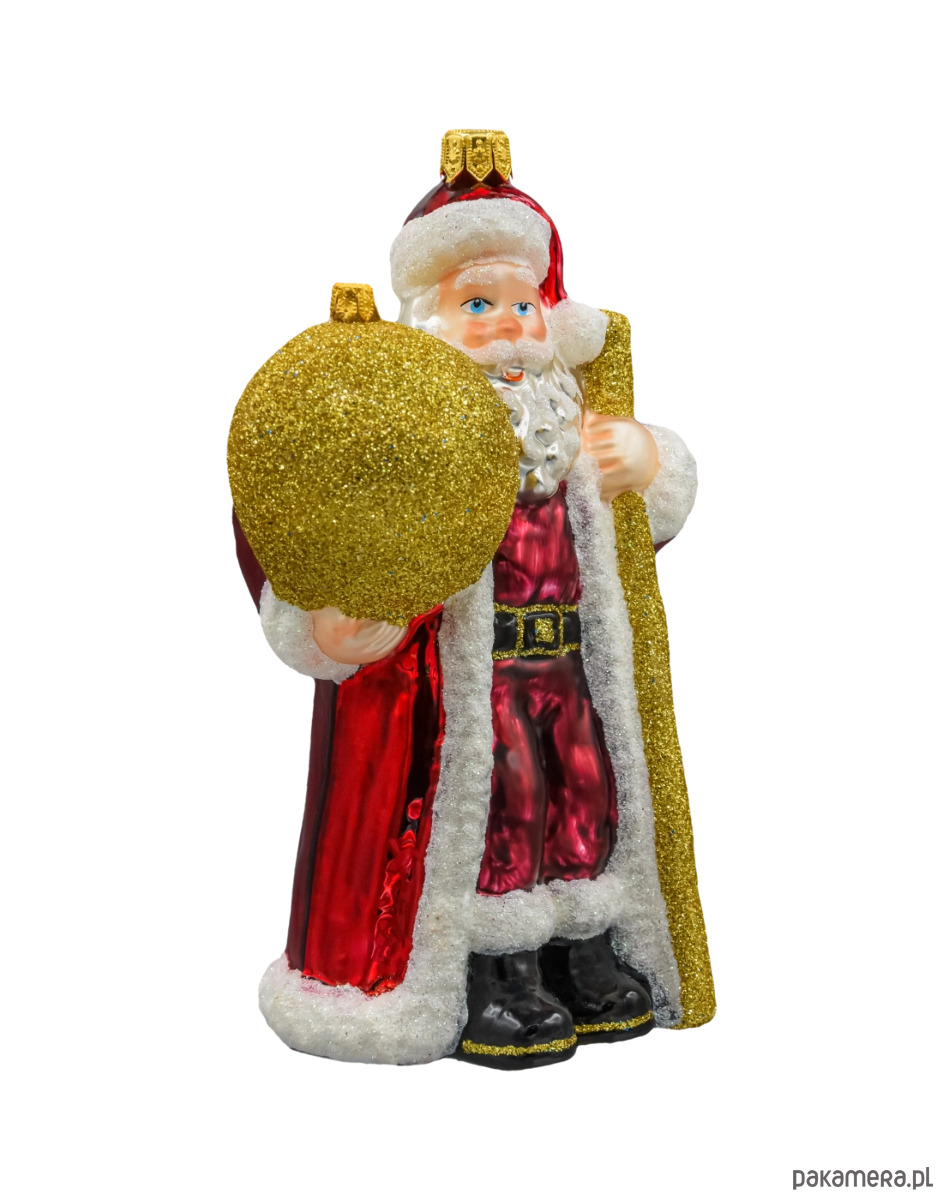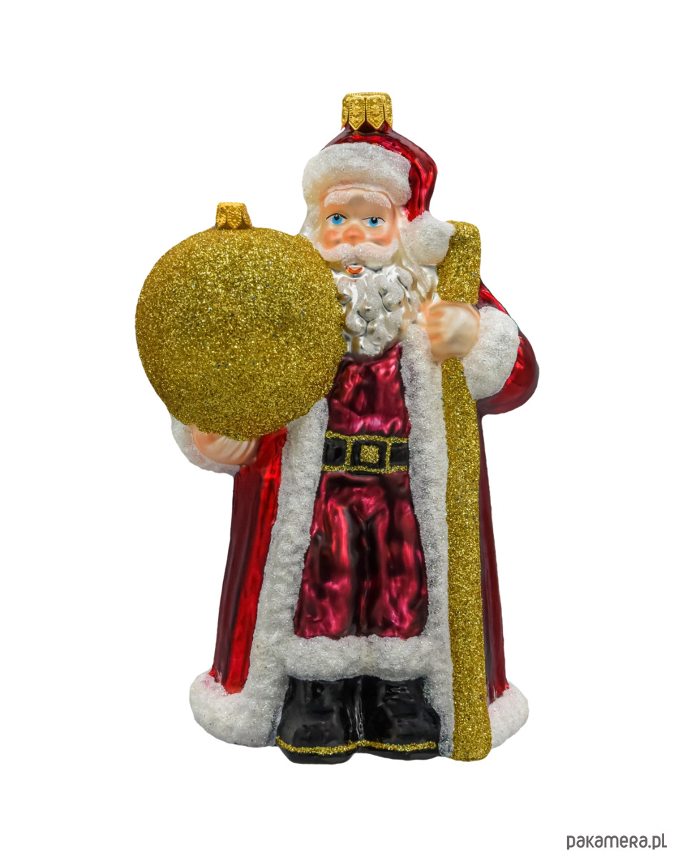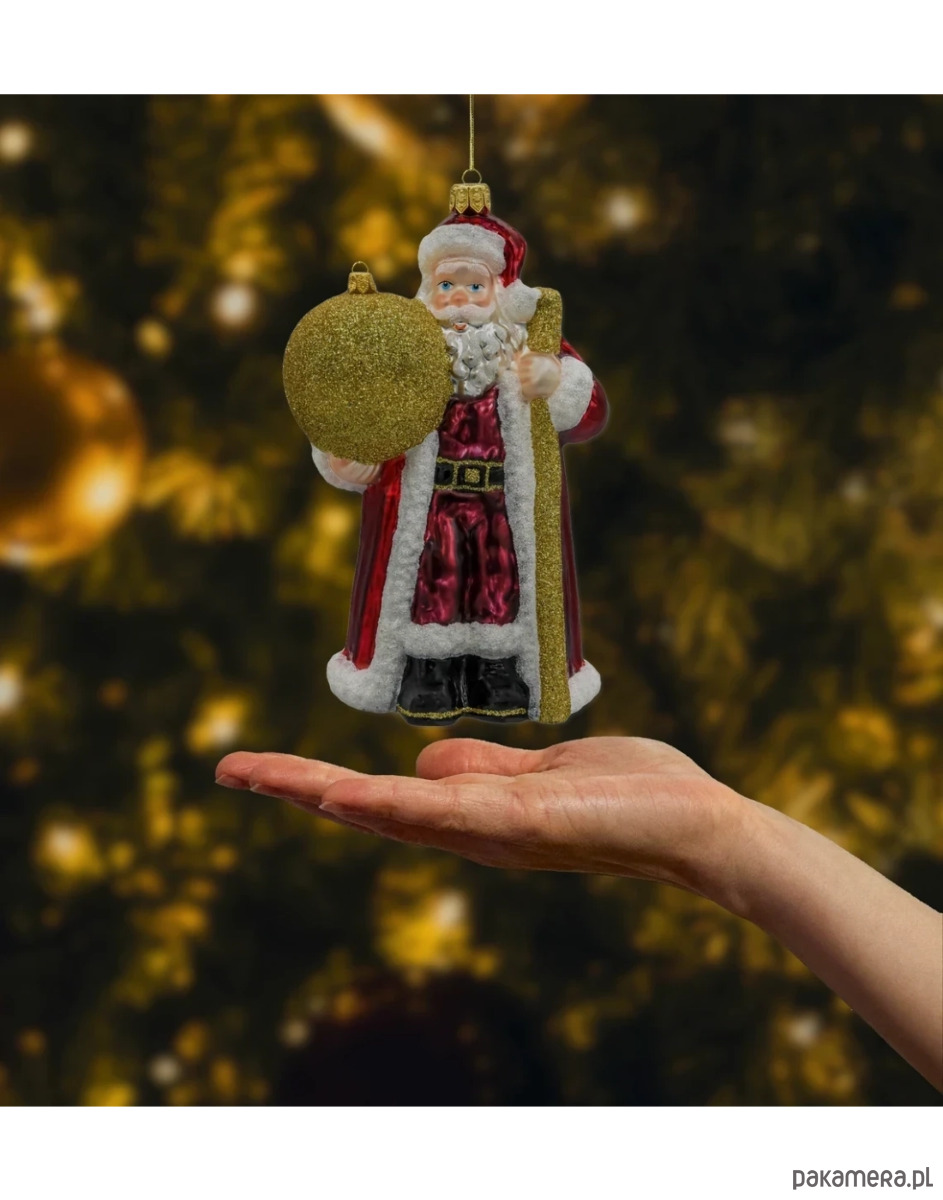Ta dekoracyjna bombka przedstawia Świętego Mikołaja ubranego w charakterystyczny czerwony płaszcz z brokatowym wykończeniem i białym futerkiem. Mikołaj trzyma w jednej ręce złotą, połyskującą bombkę, a w drugiej złoty pastorał, symbolizujący jego dostojność i opiekę. Zwraca uwagę dopracowanymi detalami – od wyrazistej twarzy, przez realistyczną brodę i noszony pas, aż po elegancko wyprofilowany płaszcz i czapkę.