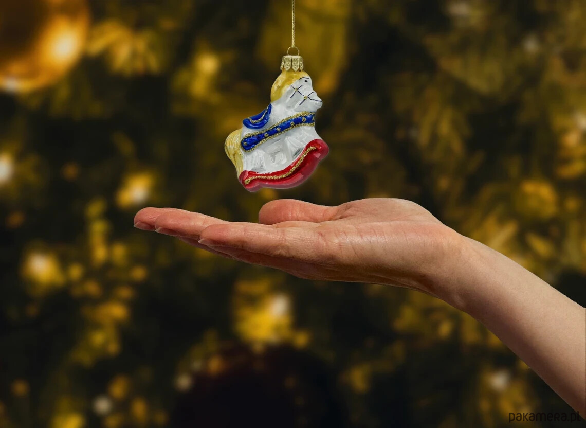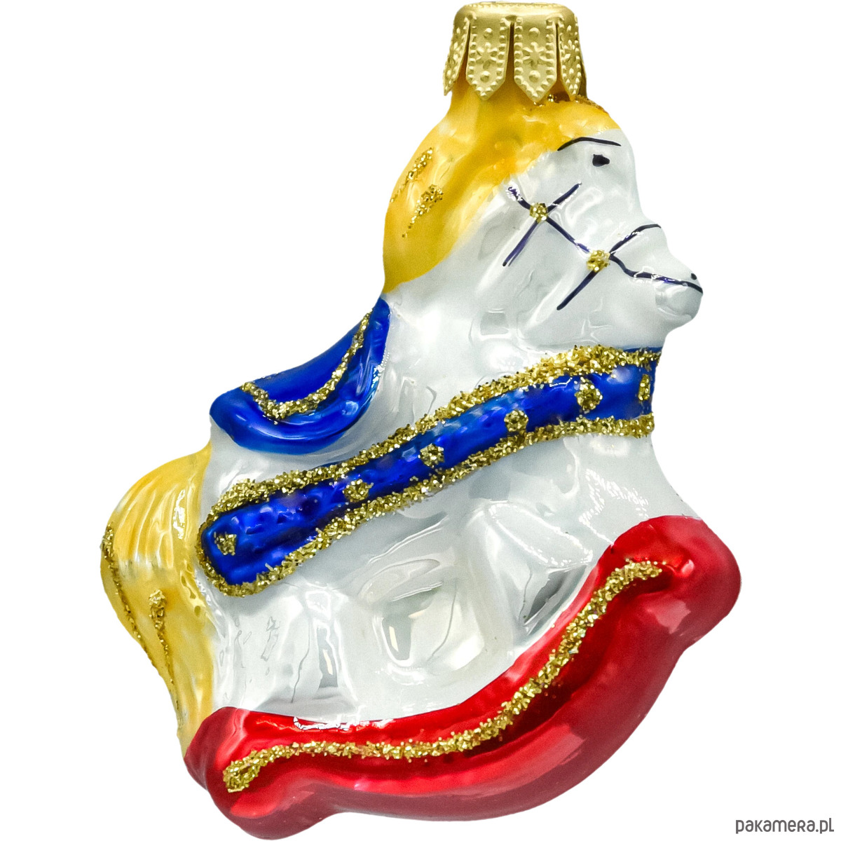 Szklana bombka choinkowa w kształcie konika na biegunach to klasyk świątecznych dekoracji w mini wydaniu. Każda sztuka została ręcznie dmuchana, srebrzona od środka i malowana w Polsce, dzięki czemu zachwyca głębią koloru i dopracowanymi detalami. Błyszczące biel i czerwień przełamane kobaltowym/niebieskim siodłem oraz złotymi akcentami i drobnym brokatem tworzą elegancką, bardzo tradycyjną dekorację świąteczną. Złota metalowa skuwka z oczkiem ułatwia zawieszenie ozdoby na gałązce, girlandzie lub w stroiku.