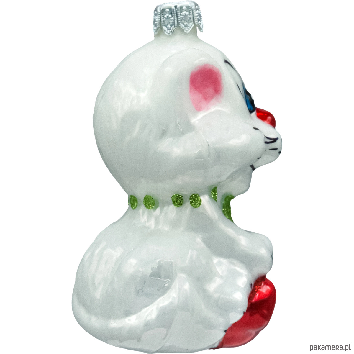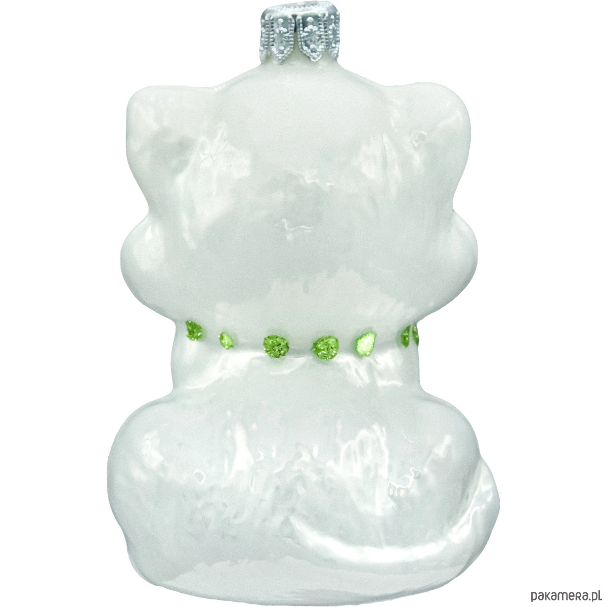 Ten uroczy kotek to ręcznie malowana szklana bombka choinkowa w rozmiarze ok. 10 cm. Błyszcząca, perłowa biel futerka, czerwone serduszko w łapkach, wyraziste niebieskie oczy, różowe uszka i limonkowa kokardka/obróżka z brokatem tworzą ciepłą, świąteczną kompozycję, która doskonale odbija światło lampek. Każdy egzemplarz powstaje z dbałością o detal – od rysunku pyszczka, przez kontury wąsów, aż po delikatny połysk szkła. To idealna ozdoba choinkowa dla miłośników kotów oraz świetny pomysł na prezent „od serca”.