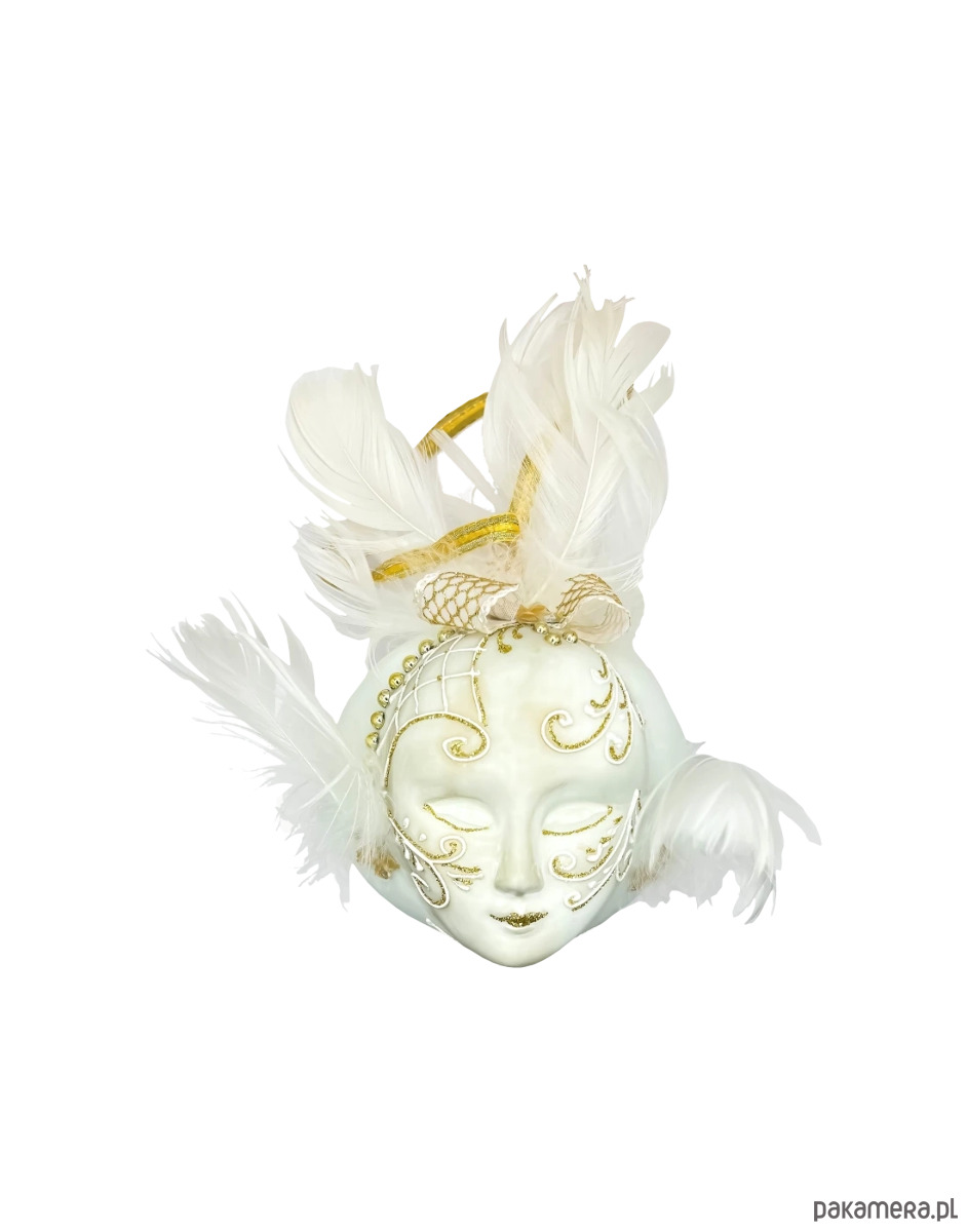 Szklaną maskę zdobią delikatne białe pióra, które dodają bombce lekkości i finezji. Pióra, umieszczone u góry maski, tworzą efekt trójwymiarowy, dzięki czemu bombka prezentuje się jeszcze bardziej okazale i elegancko. Dodatkowo, złote akcenty na piórach idealnie komponują się z całością, nadając bombce świąteczny blask.