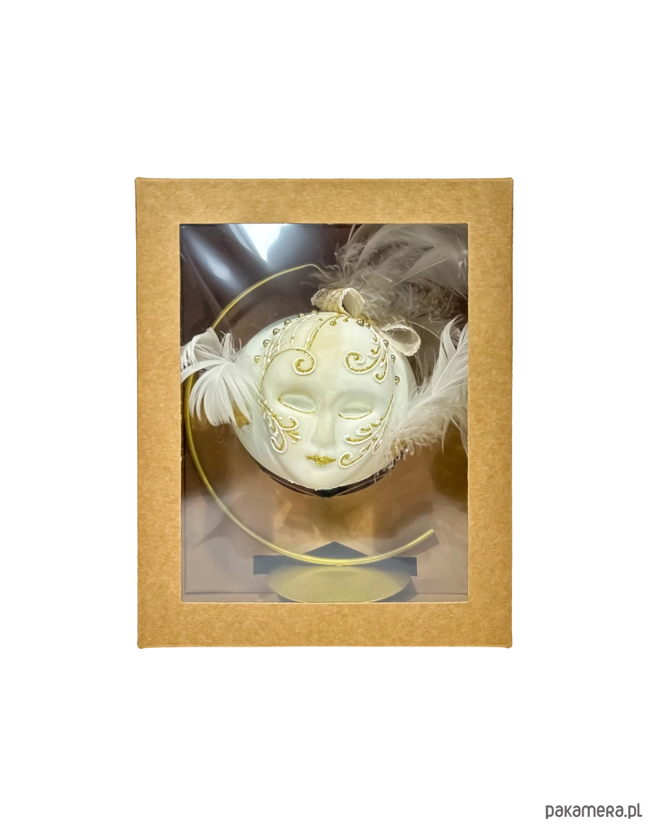 Prezentowana szklana bombka choinkowa wyróżnia się niepowtarzalnym, luksusowym wyglądem, inspirowanym tradycyjnymi weneckimi maskami. Twarz maski zdobiona jest subtelnymi złotymi ornamentami, które nadają jej elegancji i klasy. Każdy element bombki jest starannie przemyślany, a ręcznie malowane detale podkreślają jej wyjątkowość. To ozdoba, która natychmiast przyciągnie wzrok i stanie się centralnym punktem Twojego świątecznego drzewka.