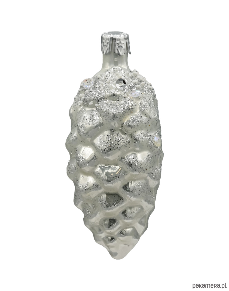 Szklana bombka choinkowa szyszka srebrna z brokatem i kryształkami – elegancka ozdoba bożonarodzeniowa