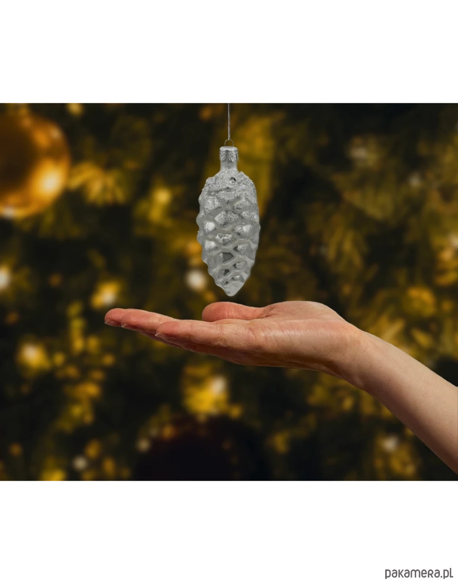 Wprowadź odrobinę zimowego blasku i leśnego uroku na swoją choinkę dzięki tej wyjątkowej szklanej bombce w kształcie szyszki. Ręcznie zdobiona brokatem w odcieniu srebra i subtelnymi kryształkami, bombka ta łączy klasykę z nowoczesną elegancją. Jej lśniąca powierzchnia pięknie odbija światło, dodając wnętrzu ciepłego, świątecznego nastroju.