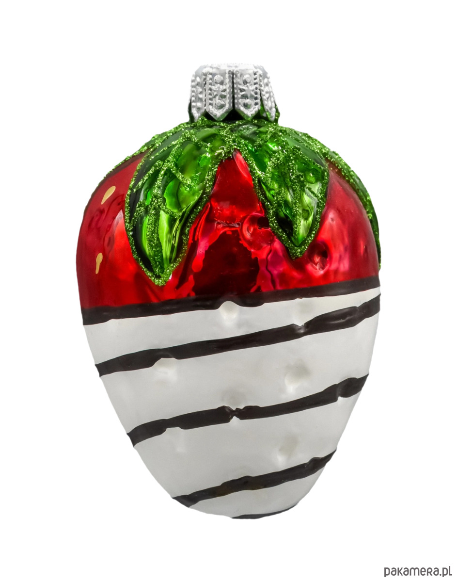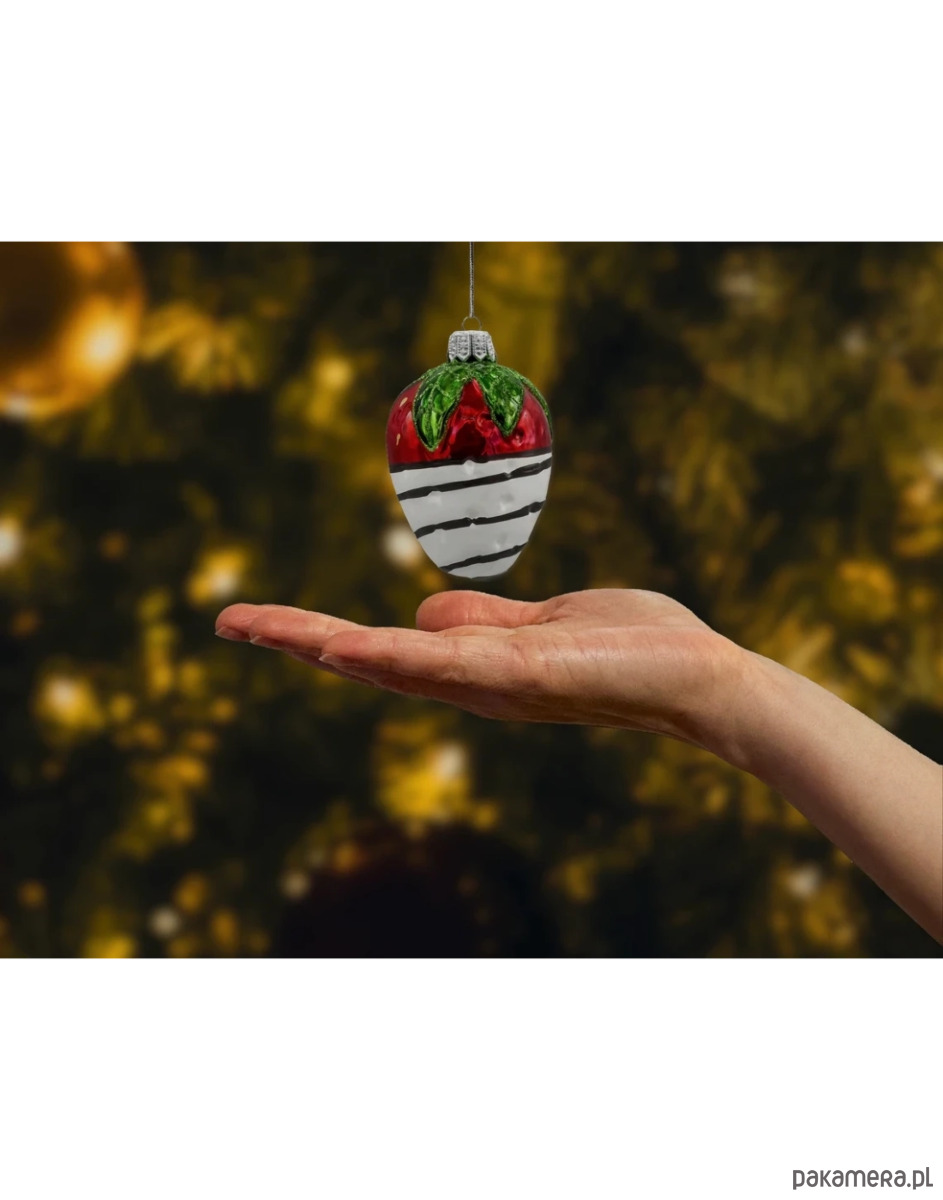 Wprowadź do swojej świątecznej dekoracji odrobinę słodkiego uroku dzięki tej wyjątkowej bombce w kształcie truskawki zatopionej w białej czekoladzie. Ręcznie wykonana z delikatnego szkła dmuchanego, bombka zachwyca intensywnie czerwonym połyskiem owocu, realistycznie odwzorowanymi pestkami i efektownym wykończeniem przypominającym polewę z białej czekolady ozdobioną ciemnymi pasami „czekoladowej” dekoracji.