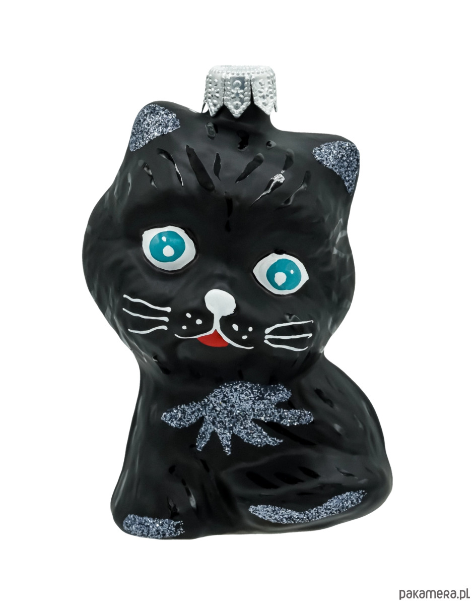 Szklana bombka w kształcie czarnego kota z niebieskimi oczami i srebrnym brokatowym wykończeniem