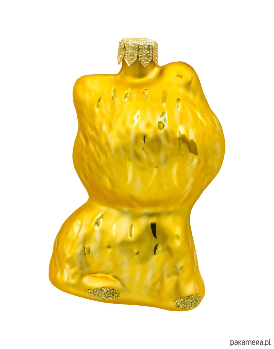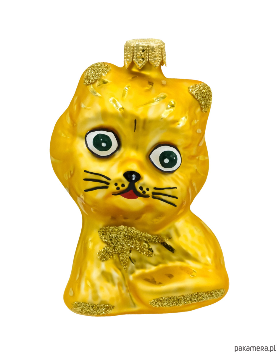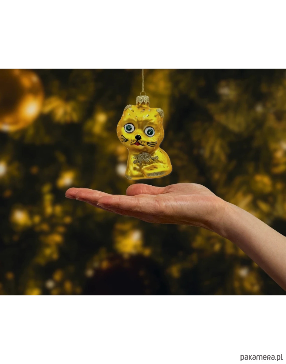 Ozdoba jest ręcznie malowana, co nadaje jej unikalny, artystyczny charakter. Złota kolorystyka nawiązuje do świątecznej atmosfery pełnej ciepła i elegancji. Idealnie sprawdzi się jako wyjątkowy dodatek do świątecznego drzewka, a także jako część kolekcji ozdób bożonarodzeniowych. Dzięki swojemu uroczemu designowi i subtelnemu blaskowi, przyciąga wzrok i stanowi doskonałą propozycję na prezent dla miłośników kotów oraz świątecznych dekoracji.
