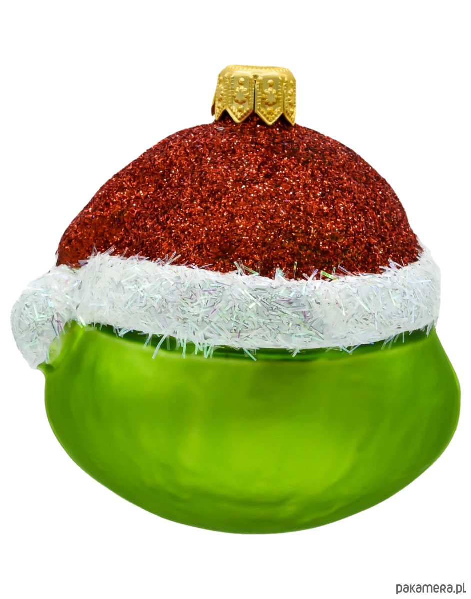 Bombka została wykonana ręcznie ze szkła dmuchanego i starannie pomalowana – soczysta zieleń twarzy, wyraziste żółte oczy z czerwonym brokatem, czarna kreska brwi oraz czerwono-biała czapka zdobiona błyszczącym brokatem nadają jej charakterystycznego wyrazu. To dekoracja idealna zarówno dla dorosłych, jak i starszych dzieci, którzy cenią sobie oryginalność i poczucie humoru.