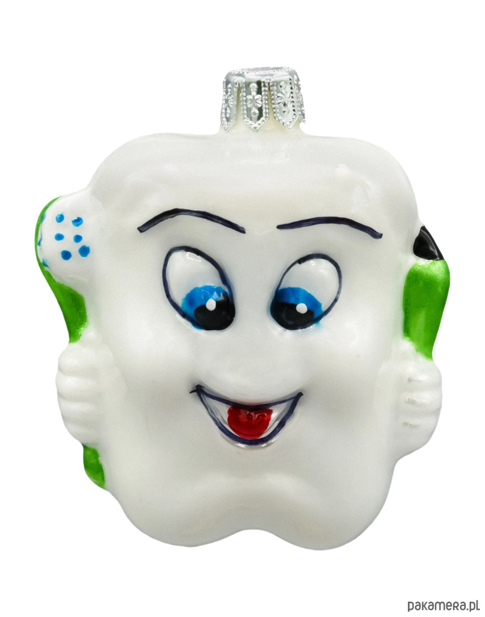Bombka przedstawia ząbek z sympatycznym wyrazem twarzy, co czyni ją doskonałym wyborem dla dzieci i osób z poczuciem humoru.