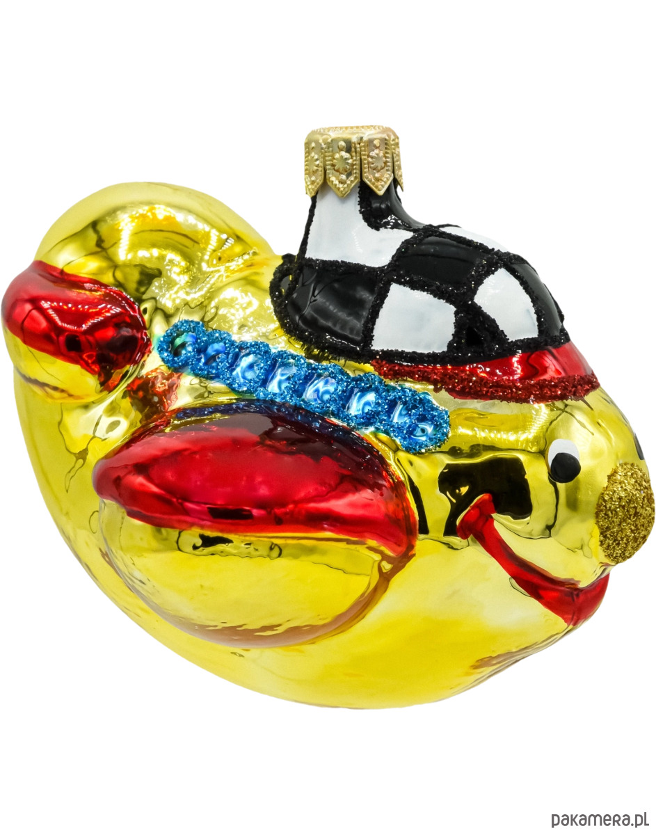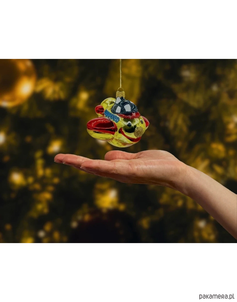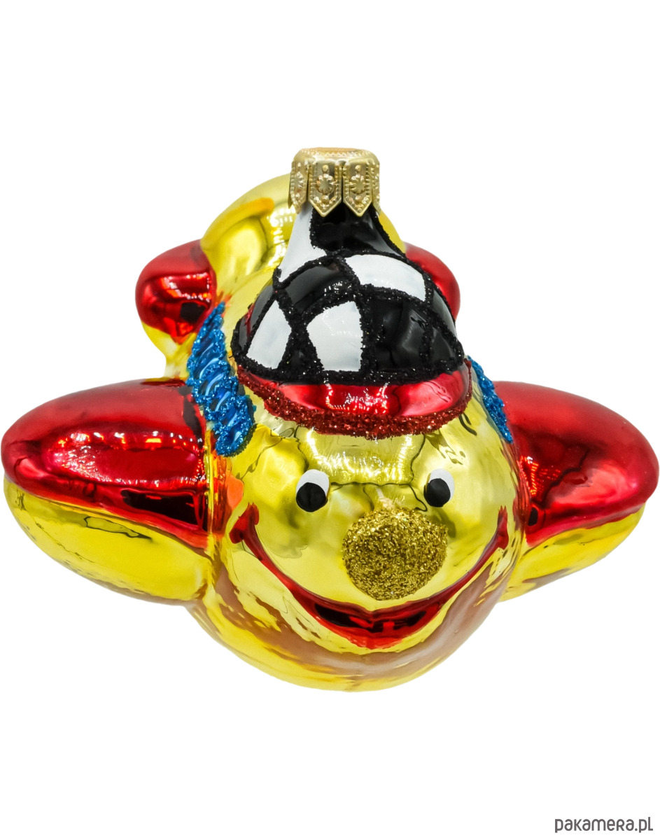 Bombka w kształcie uśmiechniętego samolotu wyróżnia się swoim radosnym wyrazem twarzy i intensywnymi kolorami, które przyciągają wzrok i rozjaśniają świąteczną atmosferę.