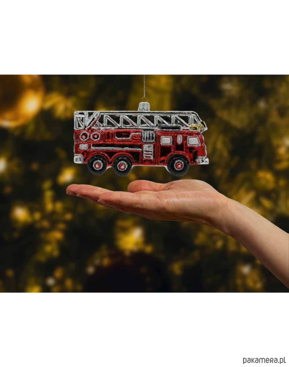 Motywy dekoracyjne: Wóz strażacki z drabiną, reflektory, detale konstrukcyjne – wszystko to oddane z dbałością o szczegóły, co sprawia, że bombka wygląd