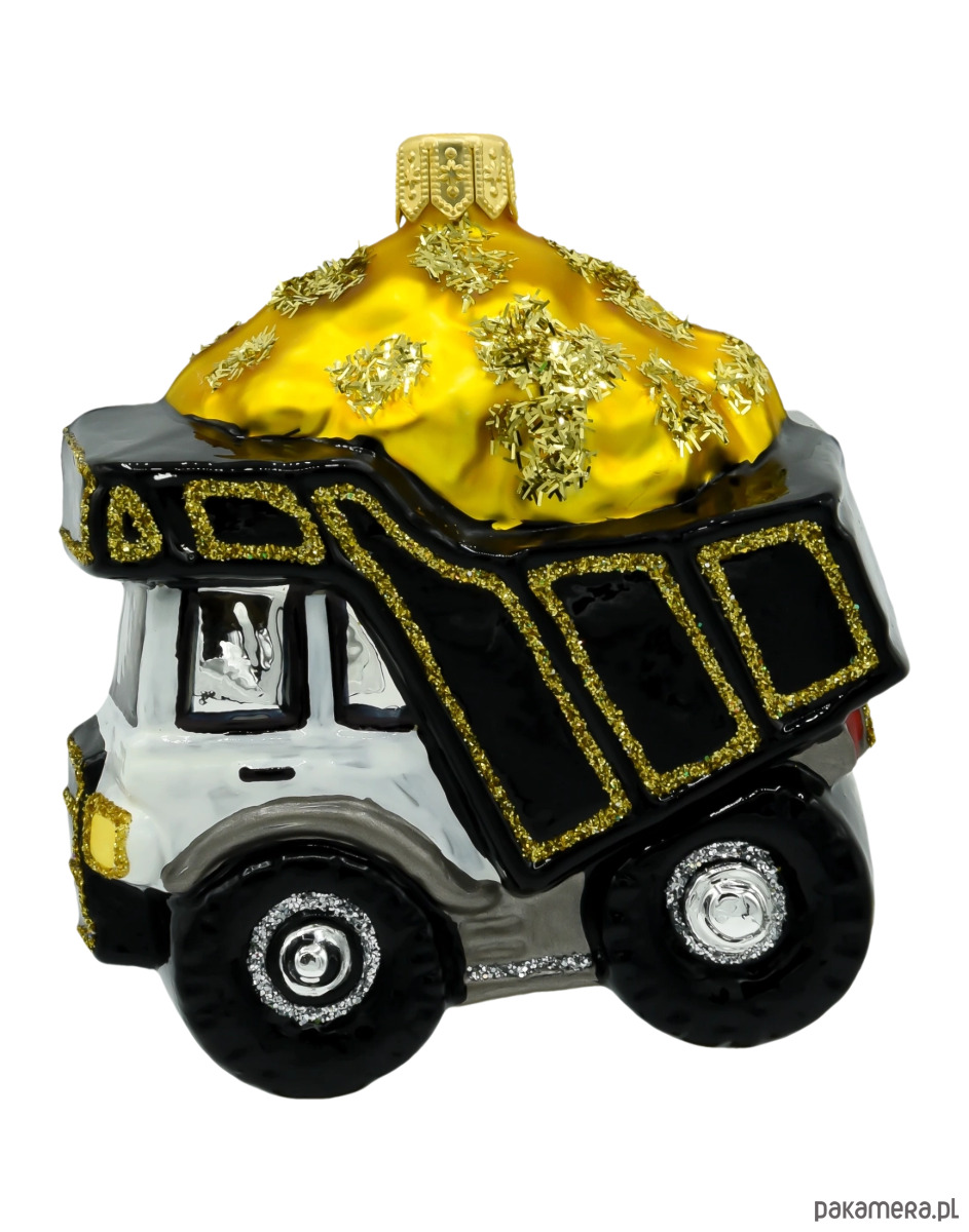 Wzbogać świąteczną choinkę o oryginalną ozdobę – bombkę choinkową w kształcie wywrotki wypełnionej złotem. Wykonana ze szkła, ta ręcznie malowana bombka wyróżnia się wysoką dbałością o detale oraz wyjątkowym, zabawnym wzornictwem. Wywrotka w kolorze czarnym z subtelnymi, złotymi akcentami jest realistycznie odwzorowana, co sprawia, że przyciąga wzrok i staje się wyjątkowym elementem dekoracyjnym. Górna część bombki, przedstawiająca “ładunek złota,” jest ozdobiona bogatym złotym brokatem, nadając bombce elegancki i luksusowy wygląd. Dlaczego warto wybrać tę bombkę?