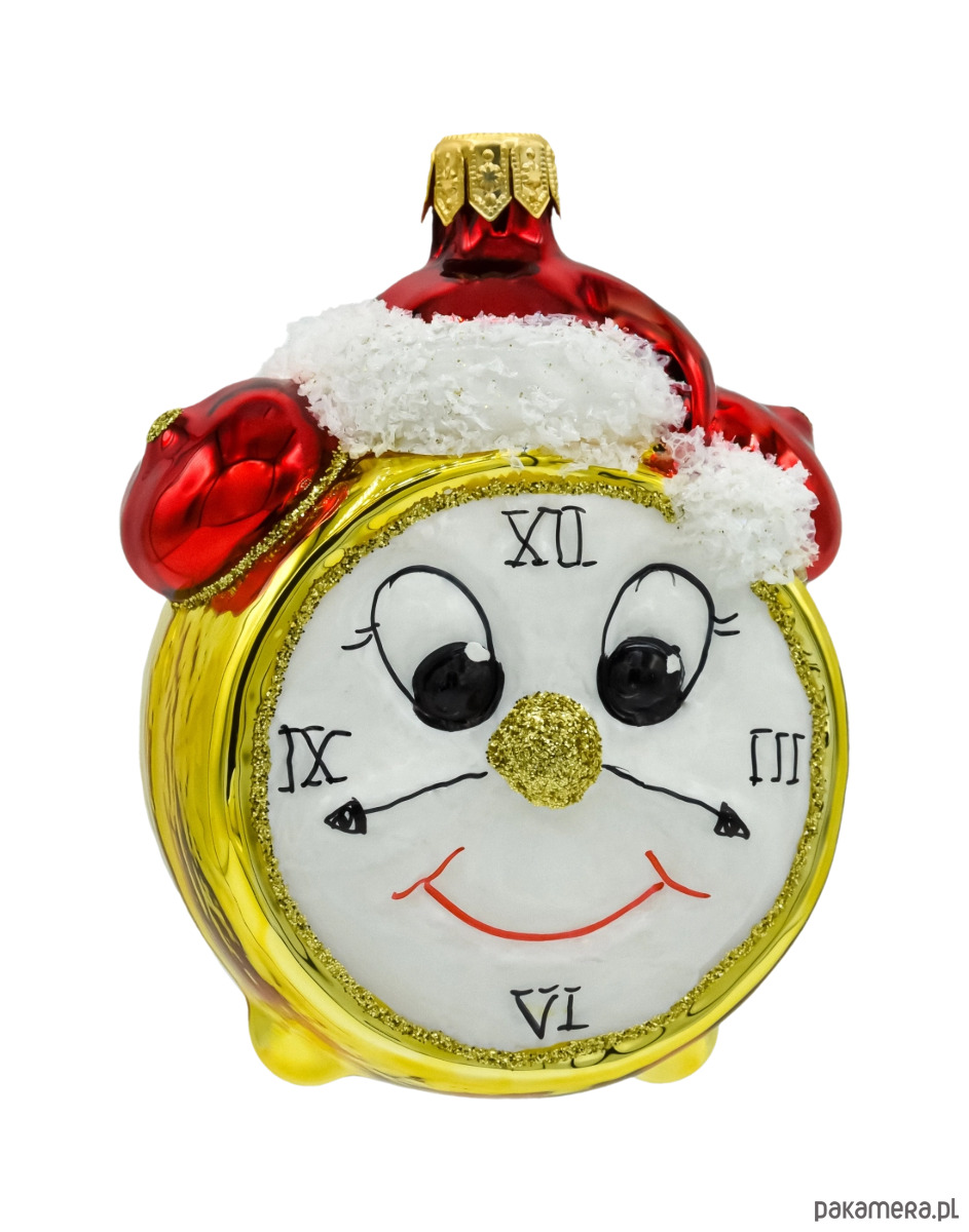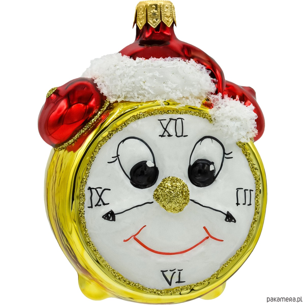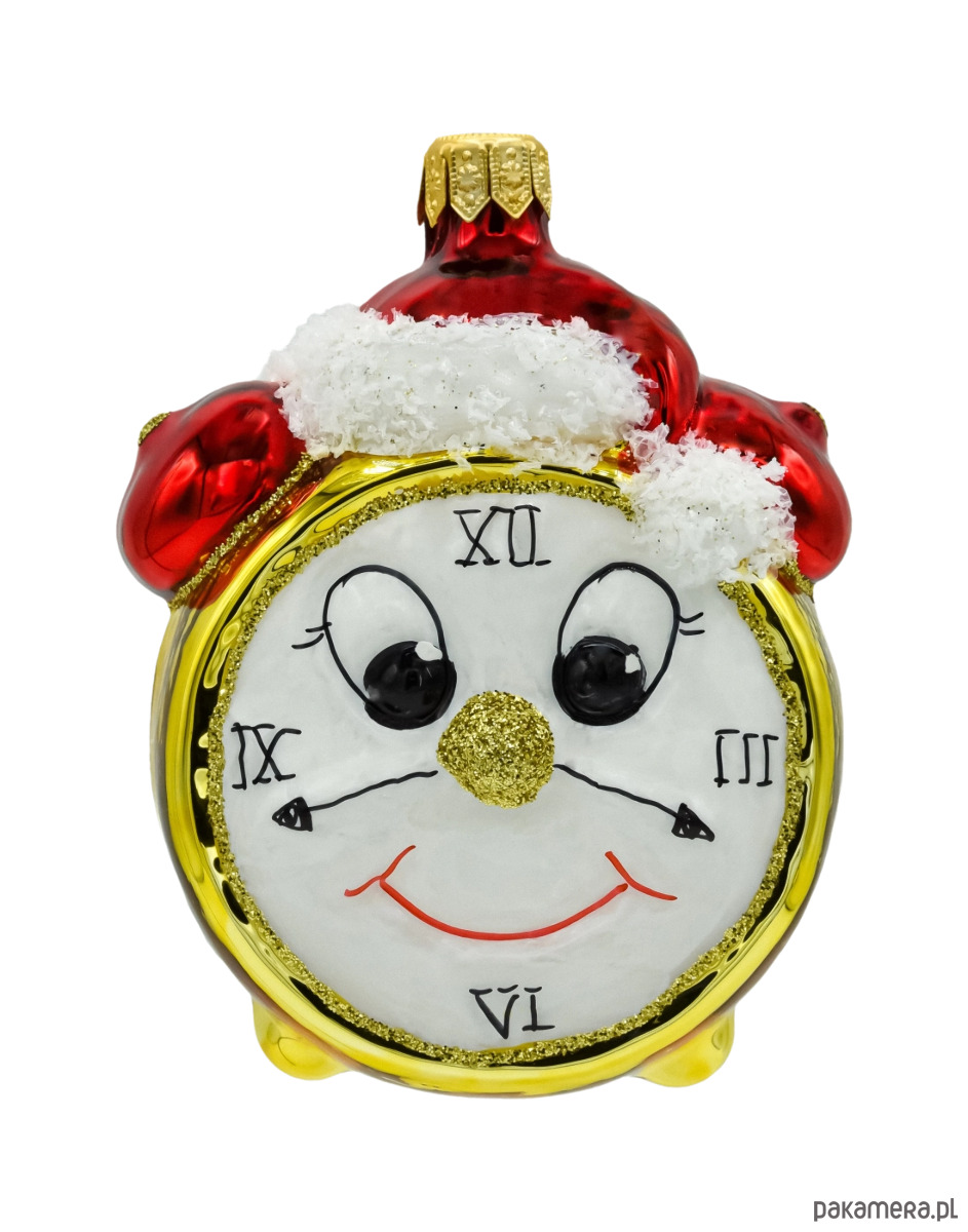 Bombka została wykonana ze szkła dmuchanego i ozdobiona brokatem w odcieniach złota, czerwieni i bieli. Czapeczka zegarka stylizowana jest na czapkę Świętego Mikołaja, co dodatkowo podkreśla świąteczny charakter ozdoby. Złote detale i opalizujące wykończenie dodają całości blasku i elegancji, dzięki czemu bombka idealnie komponuje się zarówno na klasycznej choince, jak i w nowoczesnych aranżacjach.