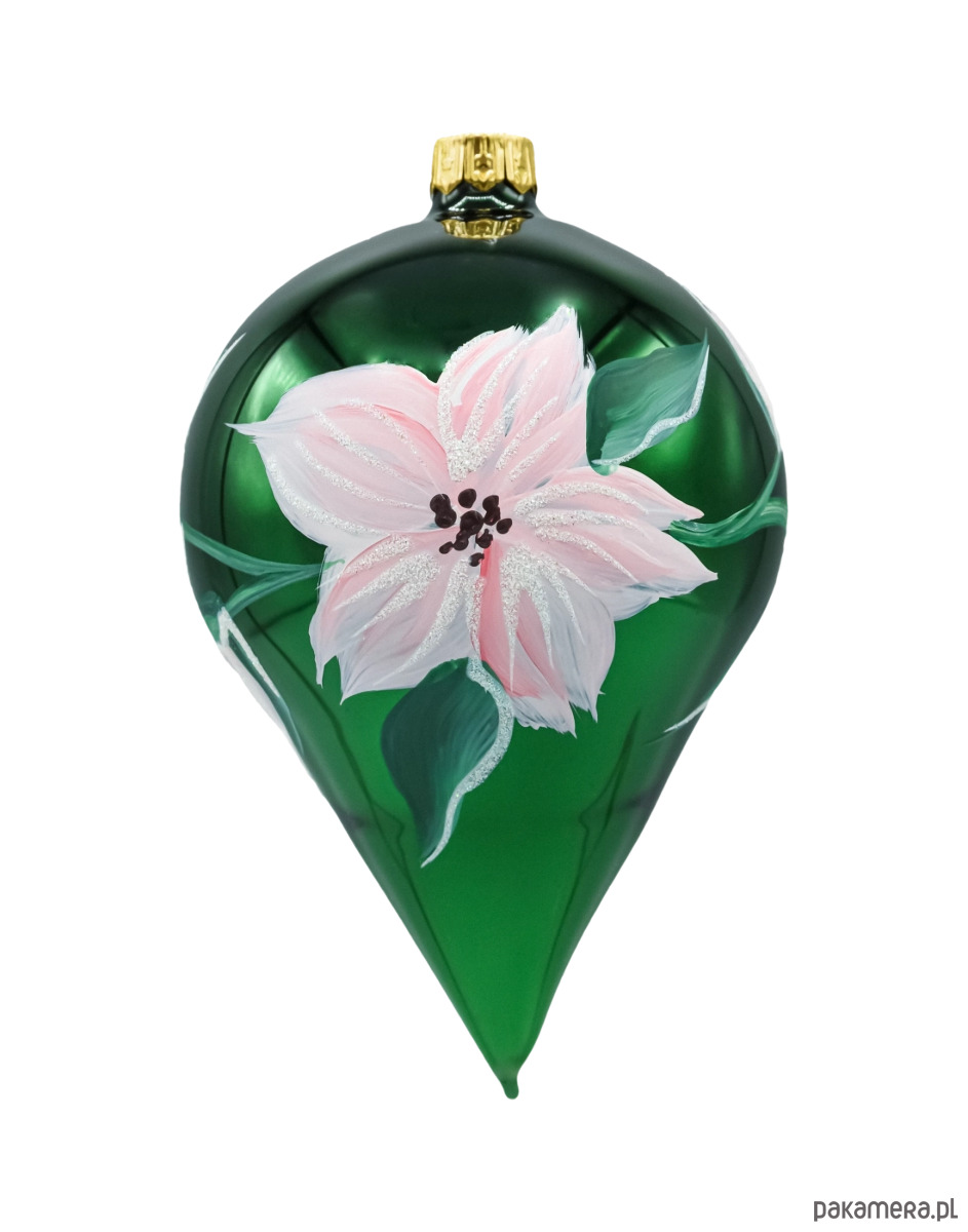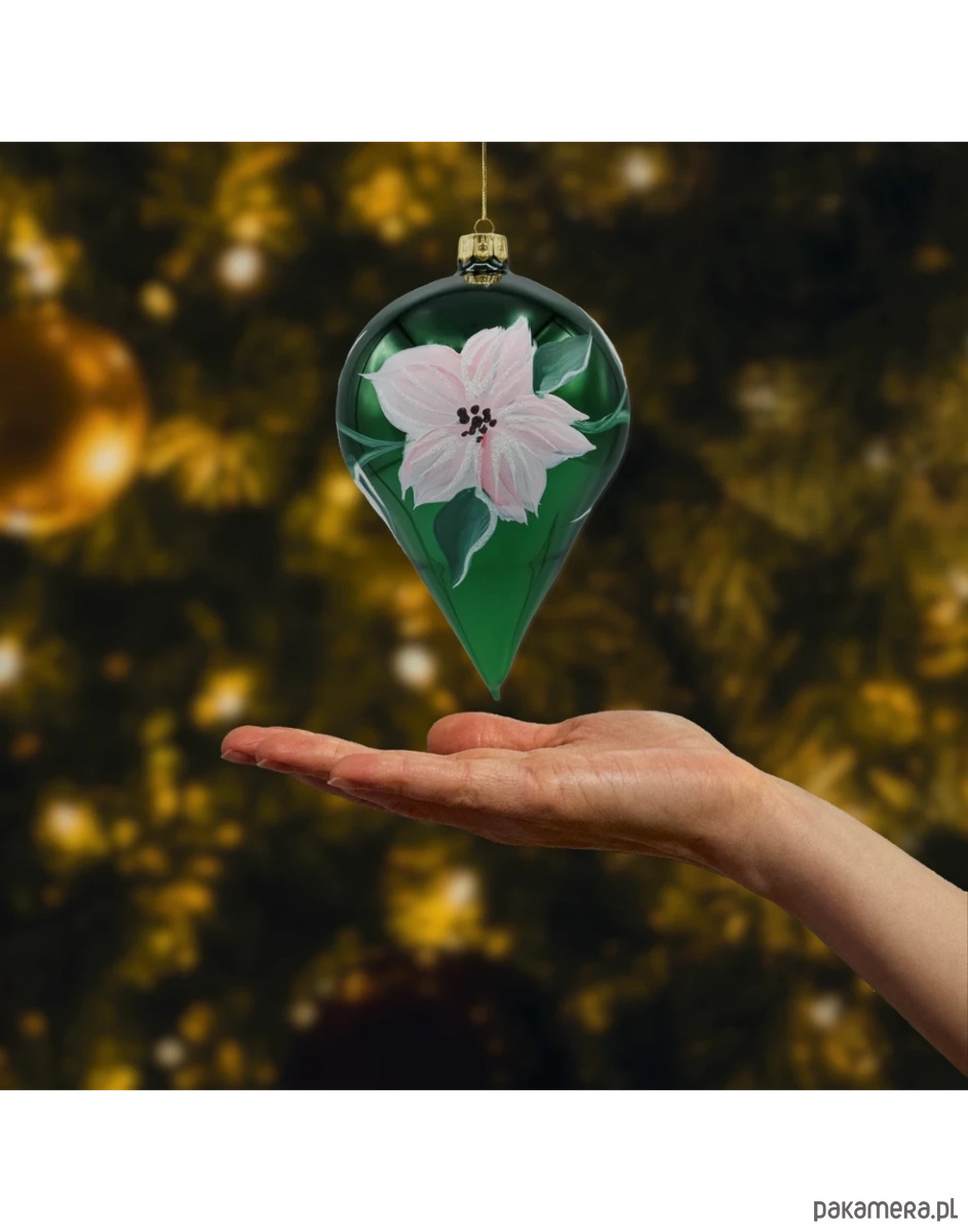 Elegancka bombka choinkowa w kształcie kropli (łezki) wykonana z cienkościennego, dmuchanego szkła. Głęboka, szmaragdowa zieleń została zestawiona z ręcznie malowanym kwiatem w odcieniach pudrowego różu, z delikatnymi akcentami brokatu i czarnymi pręcikami. Złota skuwka z oczkiem do zawieszania dopełnia całość i podkreśla luksusowy charakter ozdoby. Smukła forma pięknie odbija światło lampek, optycznie wysmuklając gałązkę choinki.