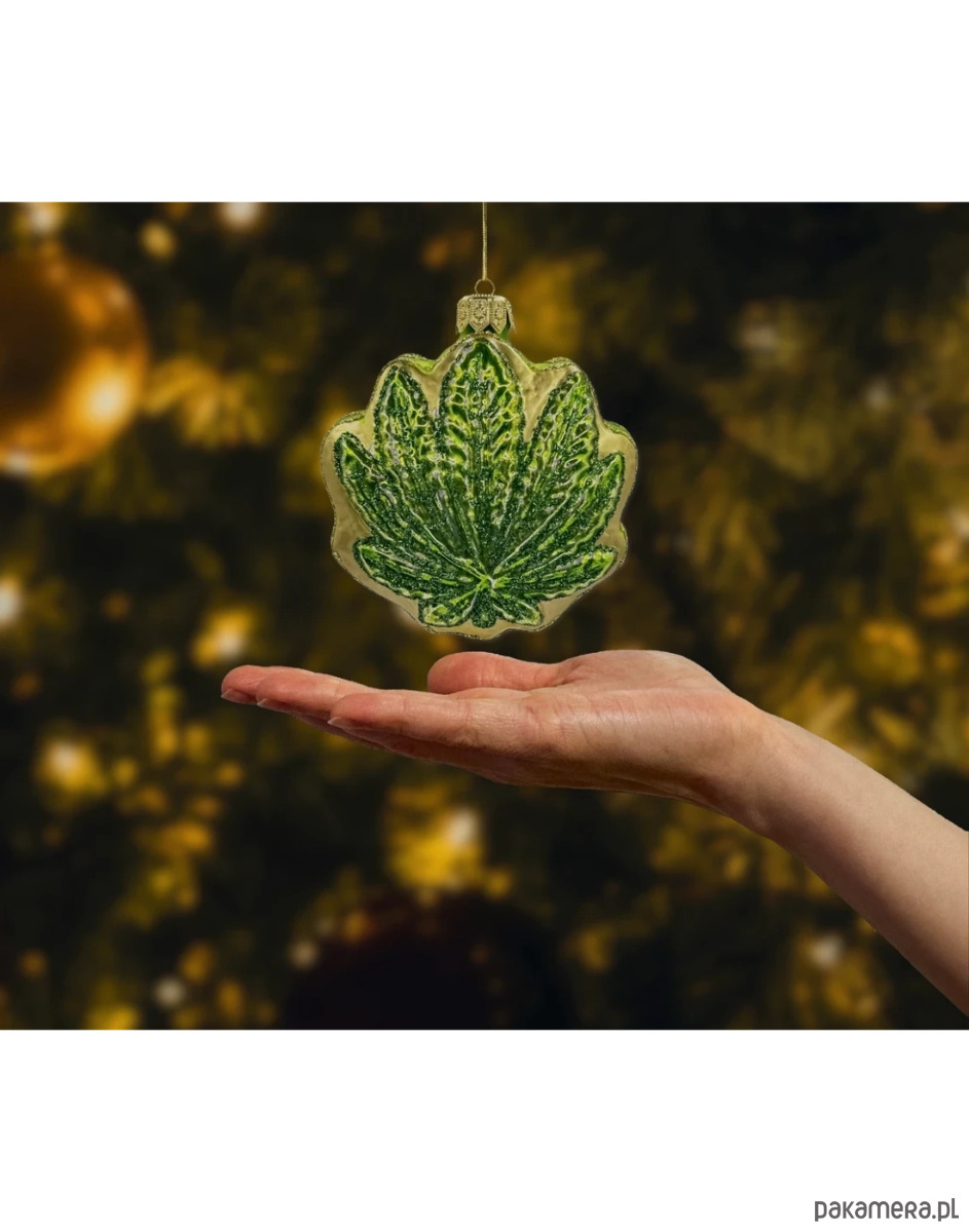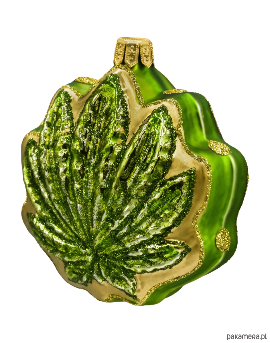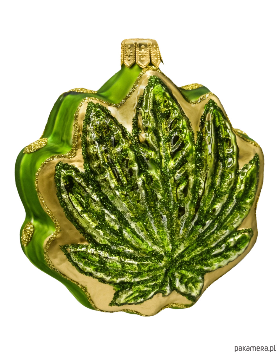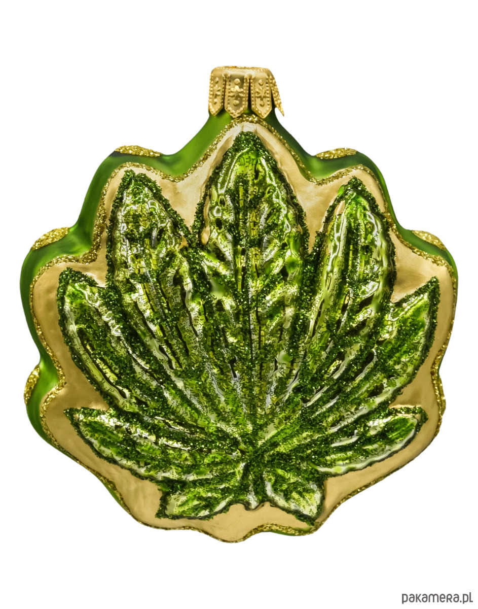 Bombka choinkowa: Zielony liść konopi z brokatem: złoty