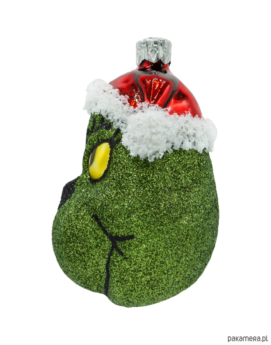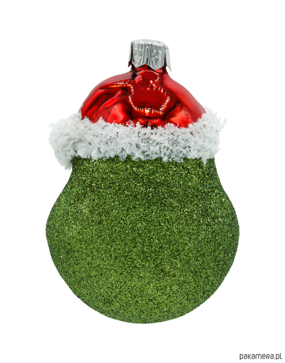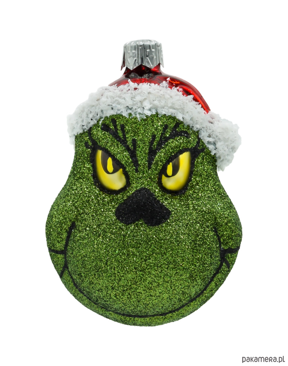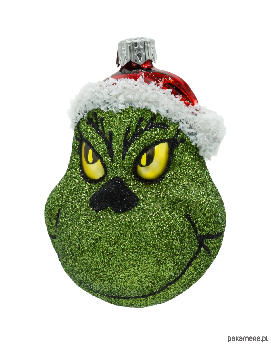 Bombka choinkowa: Zielony stwór Grinch w czapce Mikołaja: brokatowy
