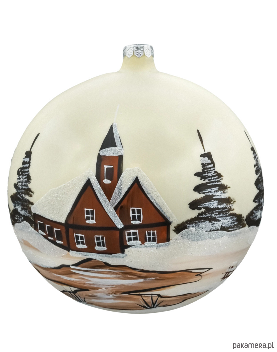 Centralnym elementem bombki jest malowniczy, czerwony kościółek otulony śniegiem, z wysoką wieżą i dachem pokrytym delikatnym brokatem. W tle widać majestatyczne drzewa, a scenerię dopełnia spokojna, zimowa wieś ukazana w ciepłej, stonowanej kolorystyce.